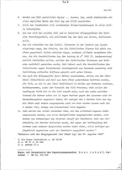 Bericht der Relation von der Tagsatzung der Fünf Katholischen Orte sowie der Abtei Sankt Gallen in Luzern vor den Vier Gemeinden von Stadt und Amt Zug
