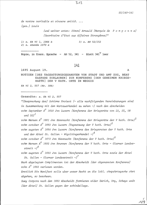 Notiz von Beat Kaspar Zurlauben, Tagsatzungsgesandter von Stadt und Amt Zug, zur...