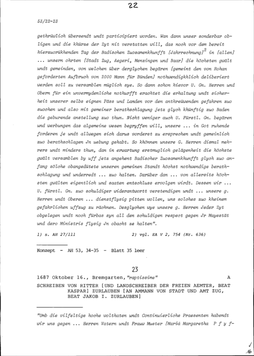Schreiben von Beat Kaspar Zurlauben, Landschreiber der Freien Ämter, an Beat Jakob I. Zurlauben, Ammann von Stadt und Amt Zug