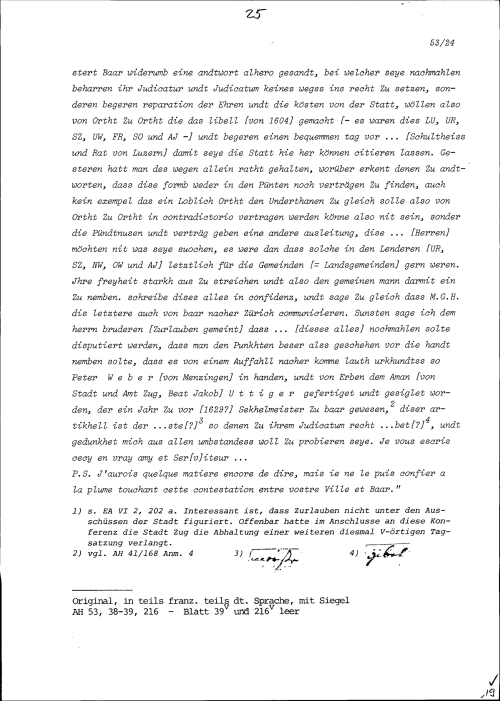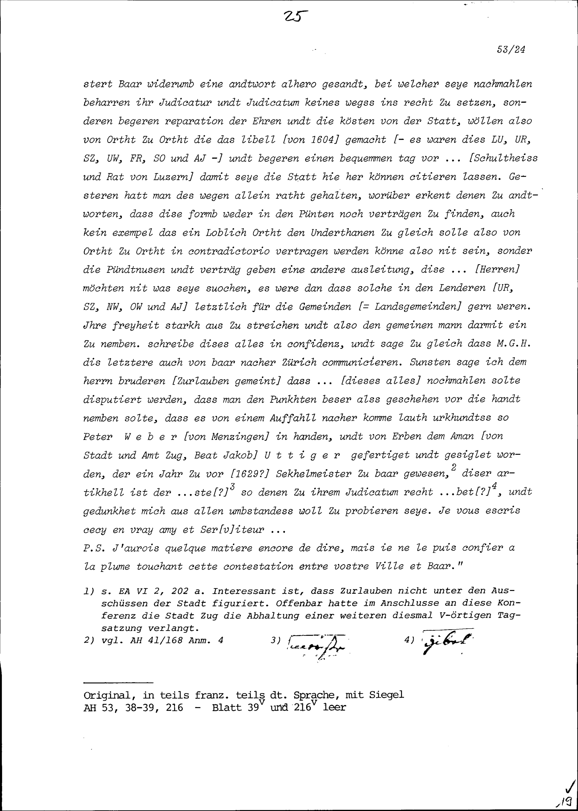 Schreiben von Rudolf Mohr, Statthalter, an Beat Jakob I. Zurlauben, Ammann, Zug