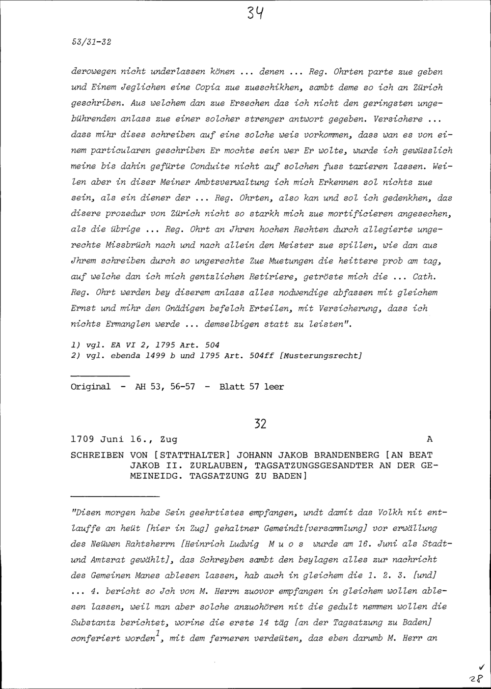 Schreiben von Johann Jakob Brandenberg, Statthalter, an Beat Jakob II. Zurlauben, Tagsatzungsgesandter an der Tagsatzung in Baden