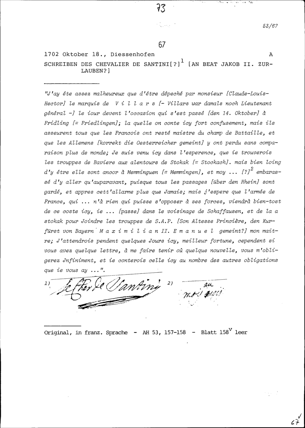 Schreiben von NN de Sandini, an Beat Jakob II. Zurlauben