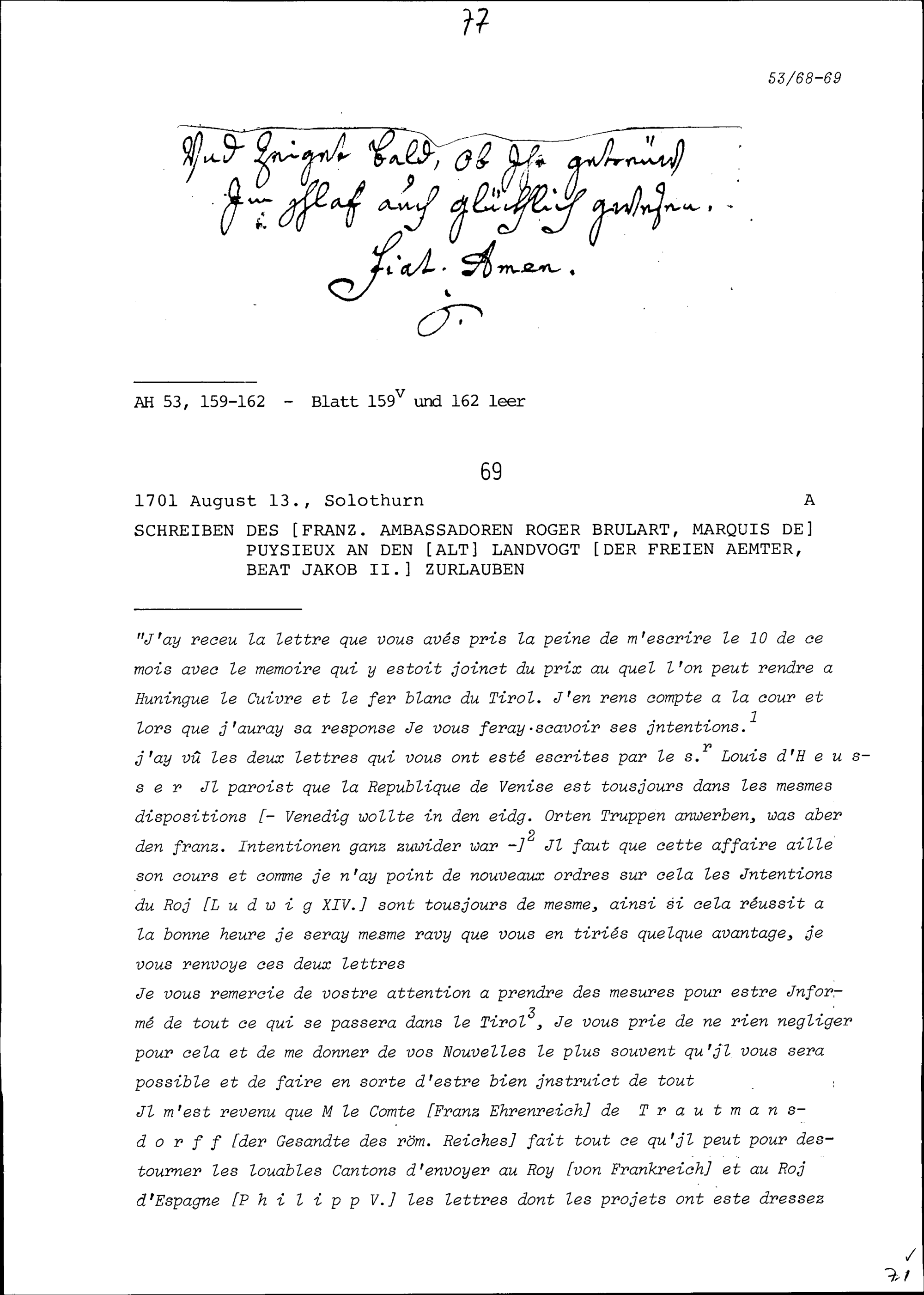 Schreiben von Roger Brûlart, Marquis de Puysieux, Ambassador von Frankreich, an Beat...