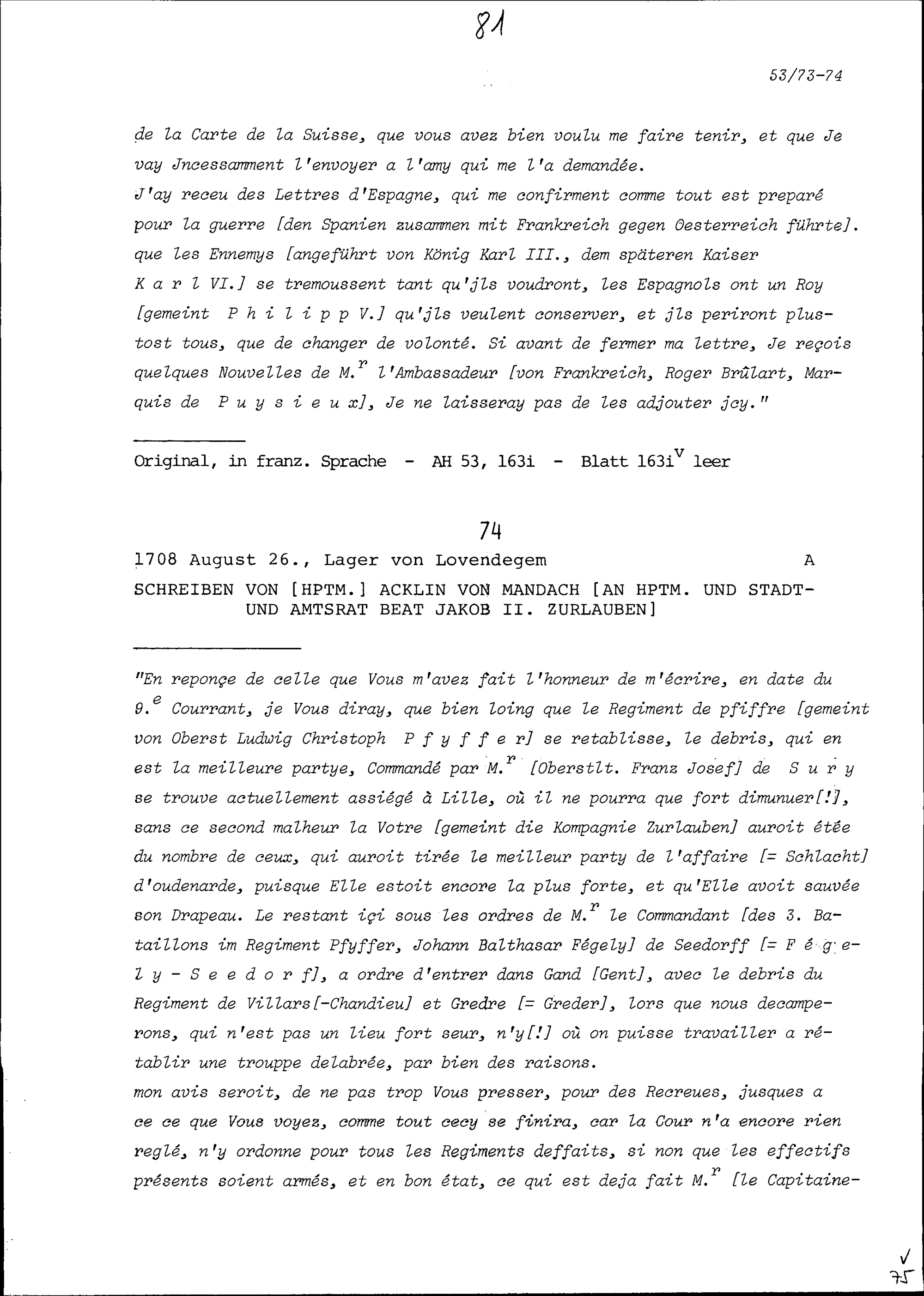 Schreiben von NN Acklin von Mandach, Hauptmann, an Beat Jakob II. Zurlauben, Hauptmann...
