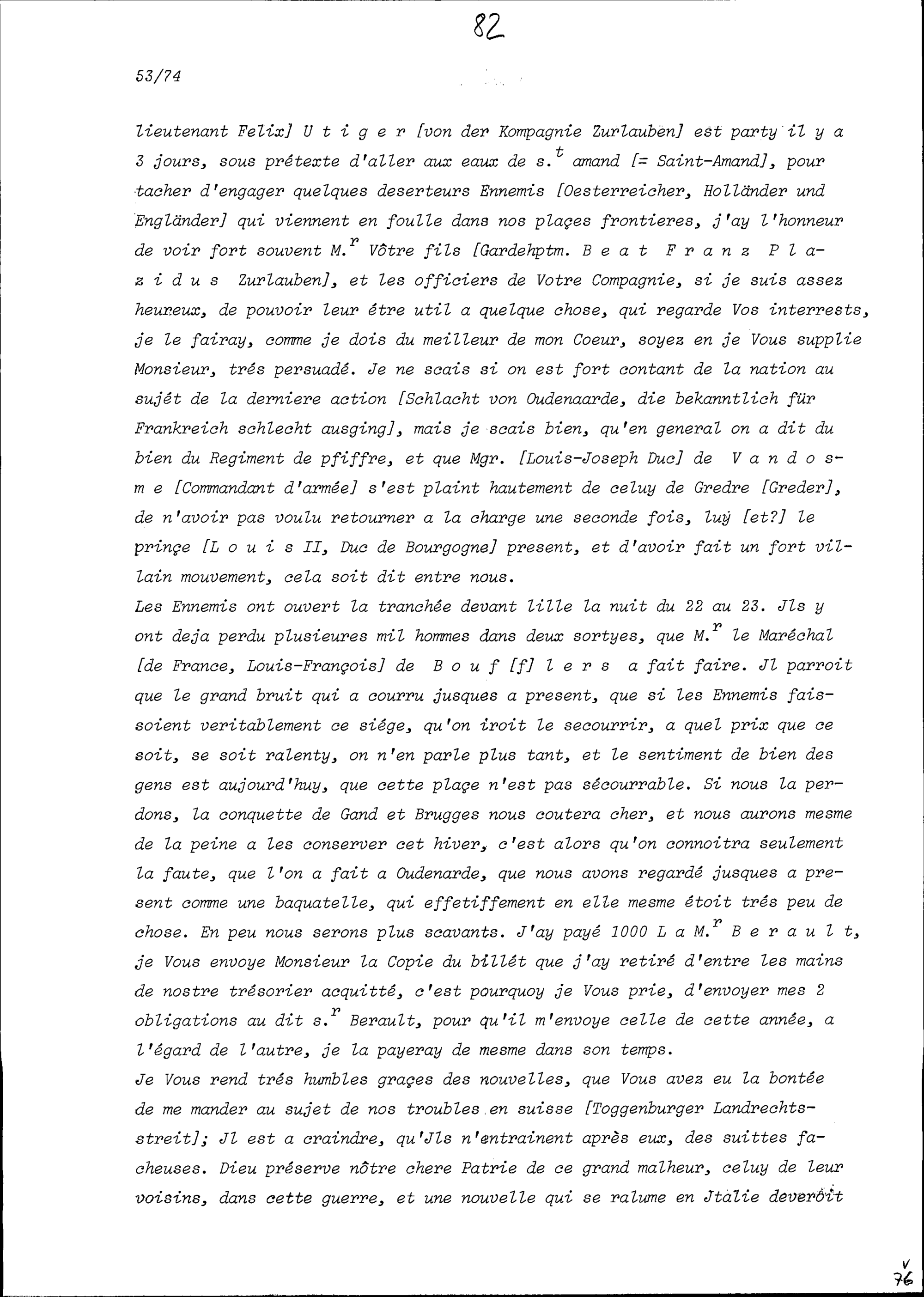 Schreiben von NN Acklin von Mandach, Hauptmann, an Beat Jakob II. Zurlauben, Hauptmann und Stadt- und Amtrat