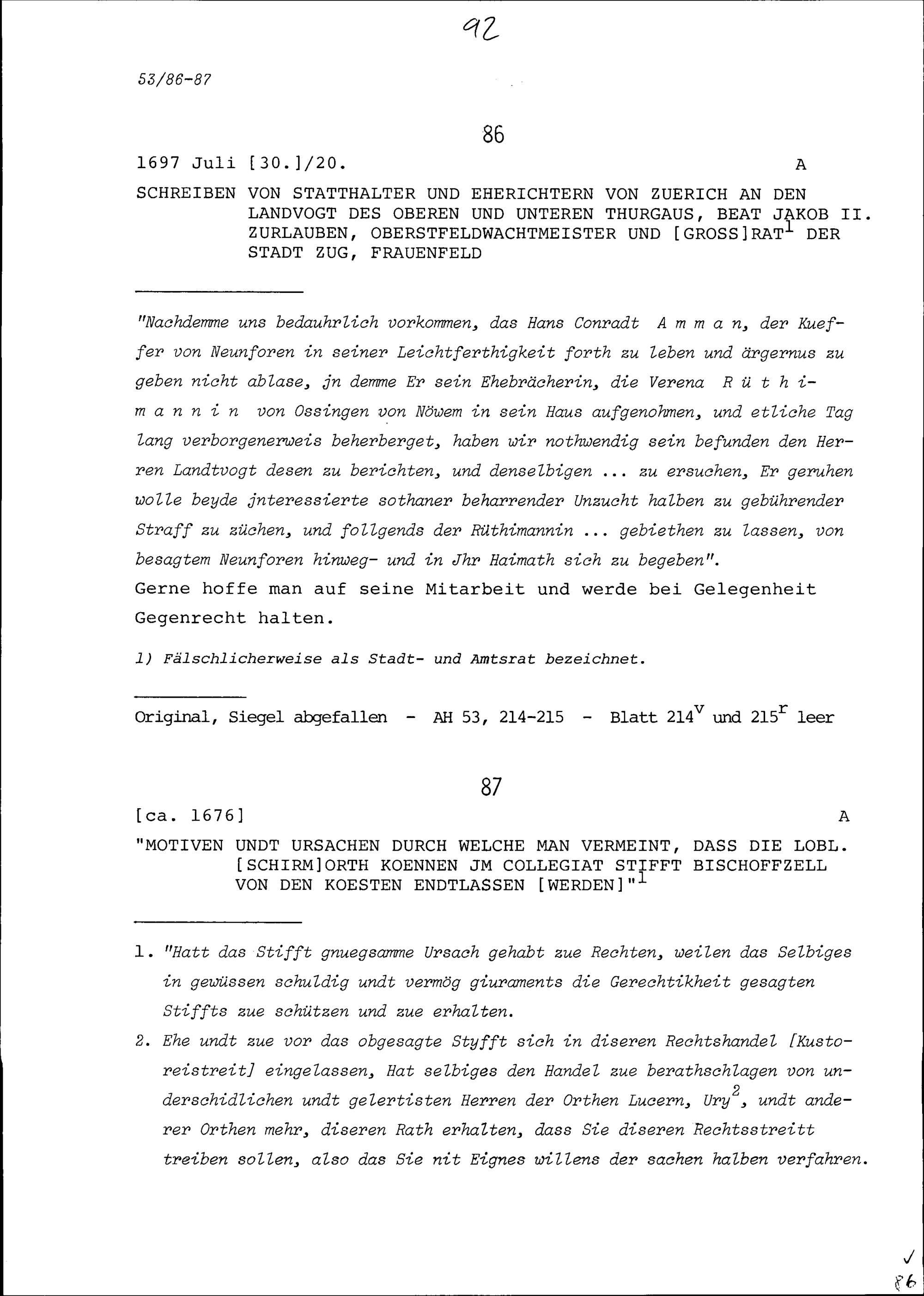 Schreiben des Statthalters und der Eherichter von Zürich an Beat Jakob II. Zurlauben, Landvogt des Oberen und Unteren Thurgaus, Oberstfeldwachtmeister und Grossrat der Stadt Zug, Frauenfeld