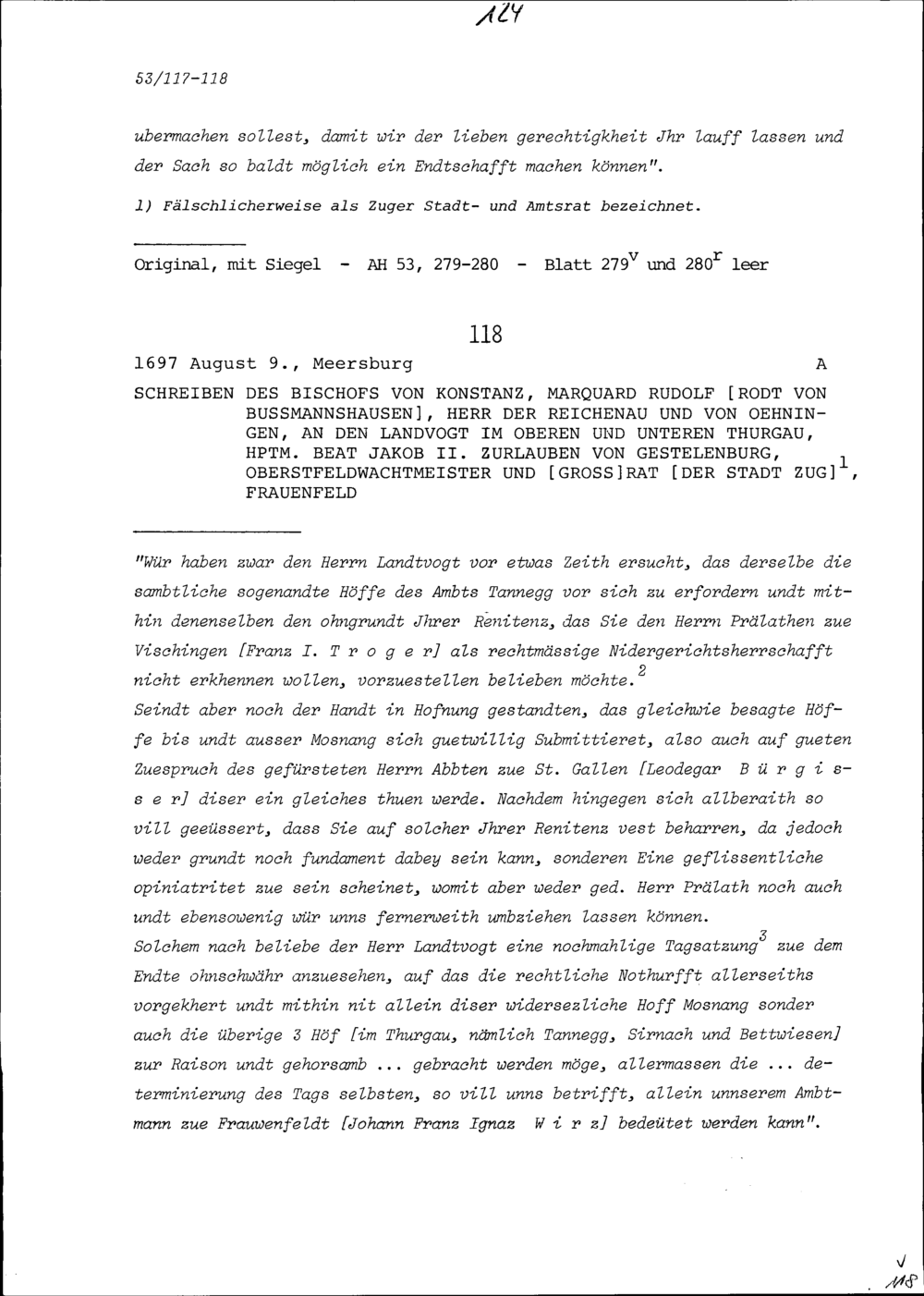 Schreiben von Marquard Rudolf Rodt von Bausmannshausen, Bischof von Konstanz, Herr der Reichenau und von Öhningen, an Beat Jakob II. Zurlauben, Landvogt im Oberen und Unteren Thurgau und Hauptmann, Frauenfeld