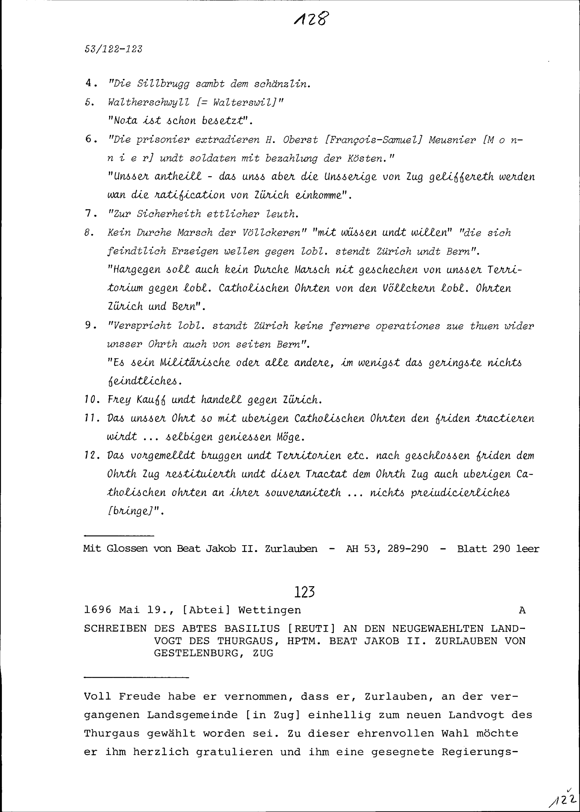 Schreiben von Basilius Reuti, Abt, an Beat Jakob II. Zurlauben, neugewählter Landvogt...