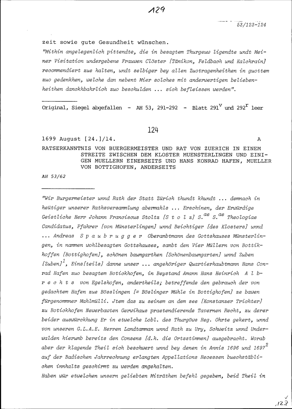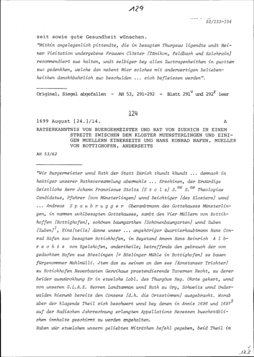 Ratsbeschluss des Bürgermeisters und Rats Zürich in einem Streit zwischen dem Kloster Münsterlingen und einigen Müllern einerseits und Hans Konrad Hafen, Müller von Bottighofen, anderseits