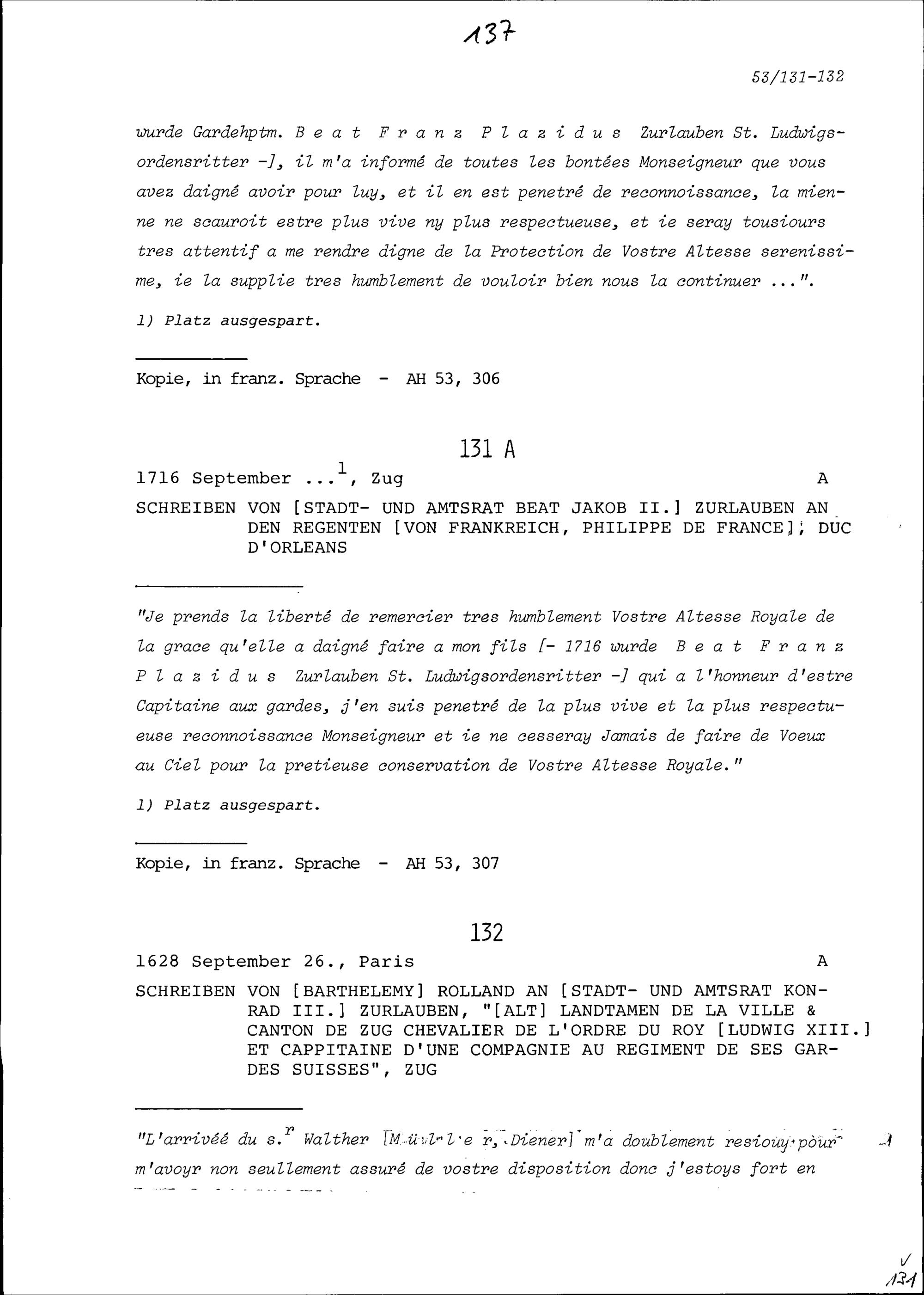 Schreiben von Beat Jakob II. Zurlauben, Stadt- und Amtrat, an Philippe de France, Duc d'Orléans. Regent von Frankreich