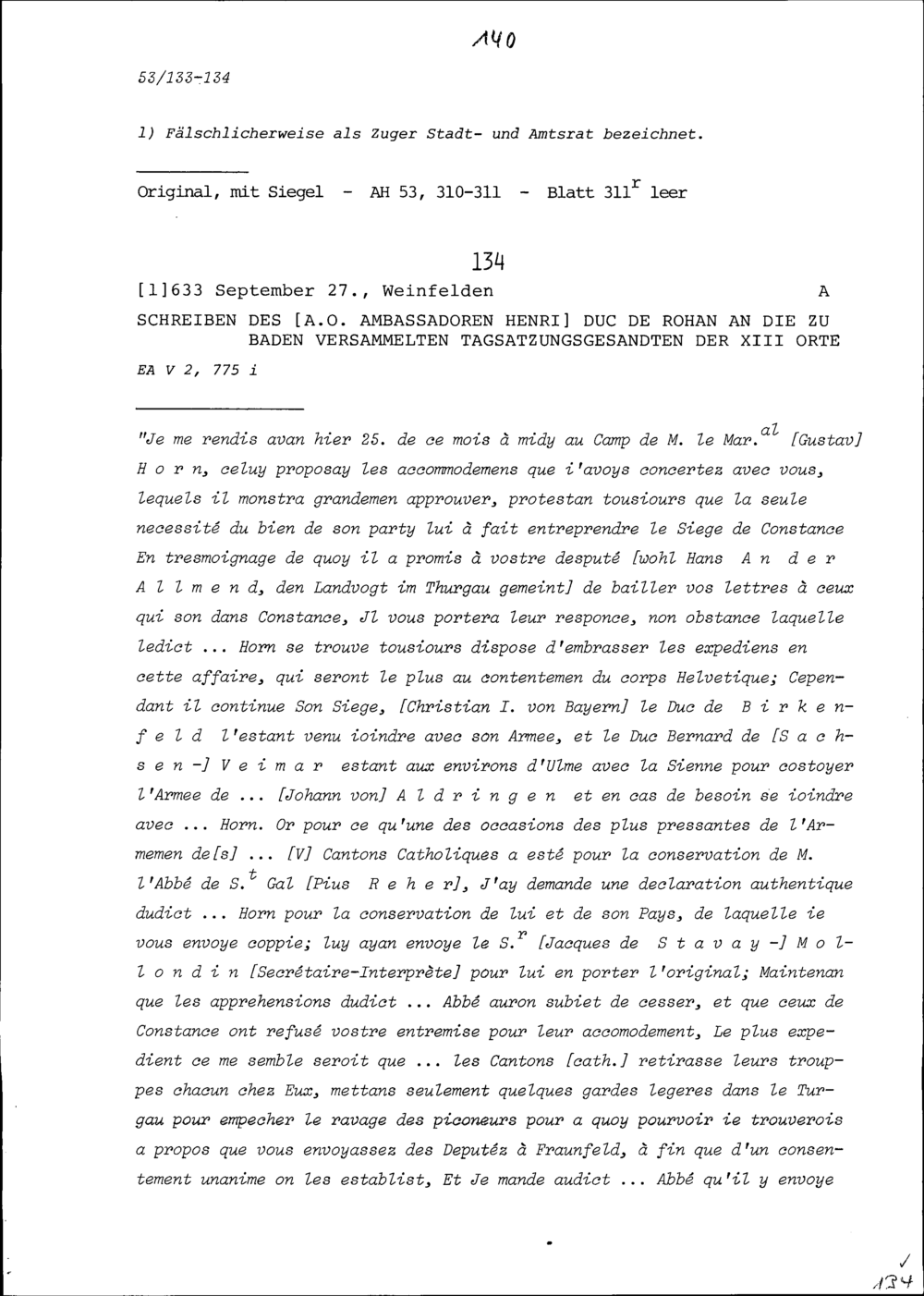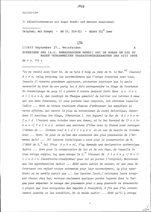 Schreiben von Henri Duc de Rohan, ausserordentlicher Ambassador, an die Tagsatzungsgesandten der Dreizehn Orte in Baden