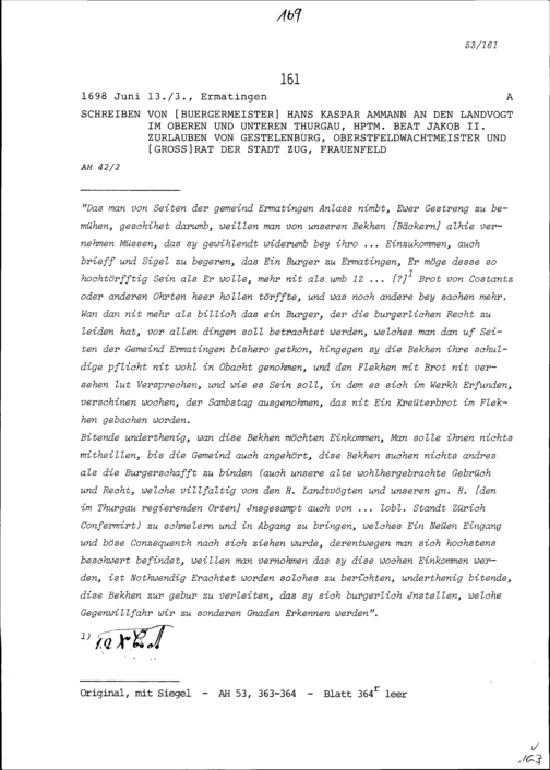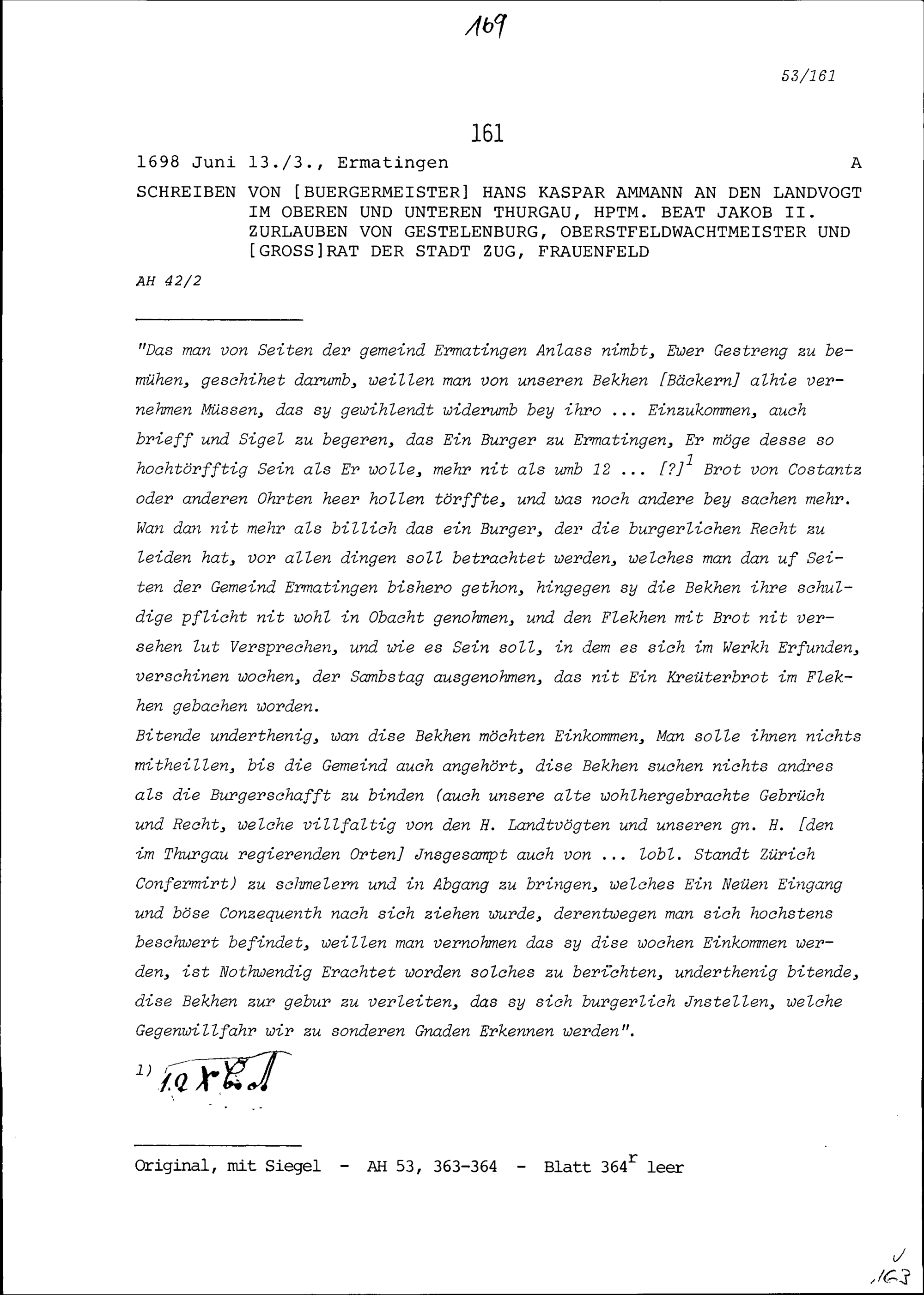Schreiben von Hans Kaspar Ammann, Bürgermeister, an Beat Jakob II. Zurlauben, Landvogt im Oberen und Unteren Thurgau und Hauptmann, Frauenfeld
