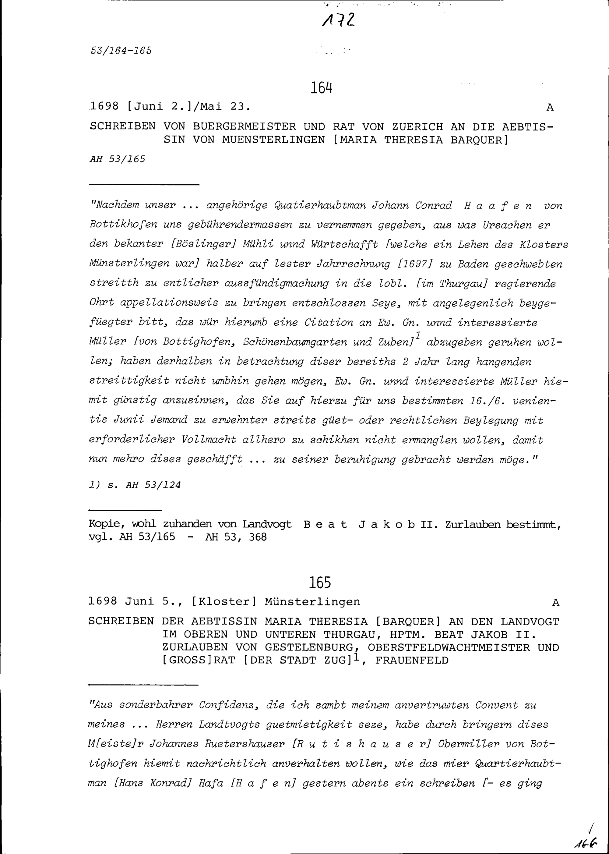 Schreiben des Bürgermeisters und Rats Zürich an Maria Theresia Barquer, Äbtissin von Münsterlingen