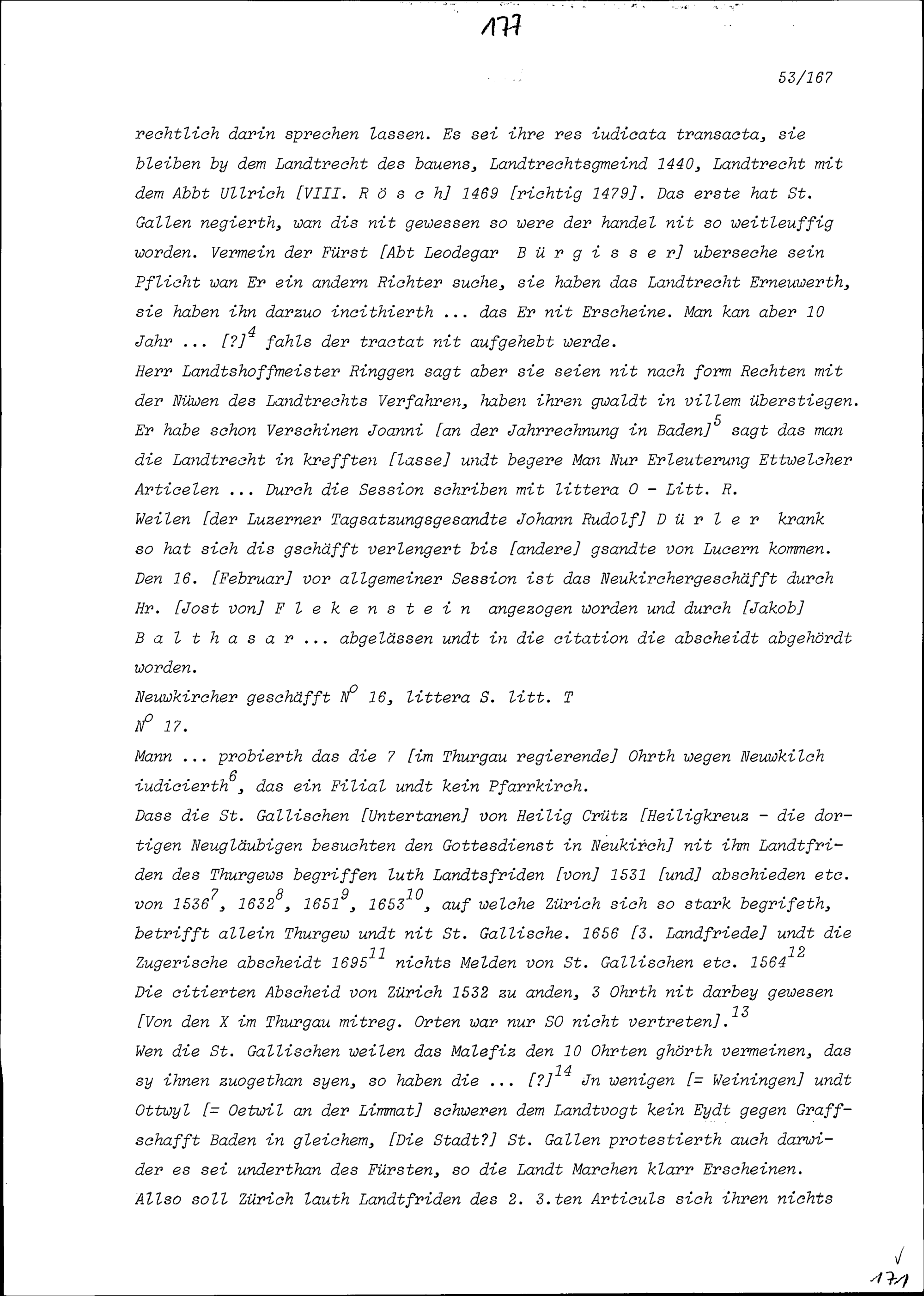Notiz von Beat Jakob II. Zurlauben, Zuger Tagsatzungsgesandter, über die ausserordentliche Tagsatzung in Baden