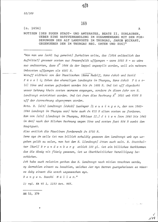 Notiz von Beat II. Zurlauben, Stadt- und Amtrat Zug, über eine Ratsverhandlung in Zusammenhang mit den Forderungen des Altlandvogts im Thurgau, Jakob Wickart, gegenüber den im Thurgau regierenden Orten und Zug