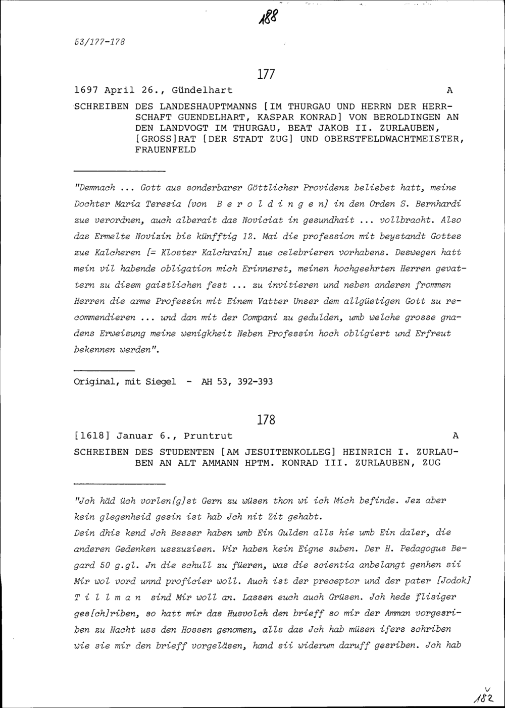 Schreiben von Kaspar Konrad von Beroldingen, Landeshauptmann im Thurgau und Herr der Herrschaft Gündelhard, an Beat Jakob II. Zurlauben, Landvogt im Thurgau, Frauenfeld