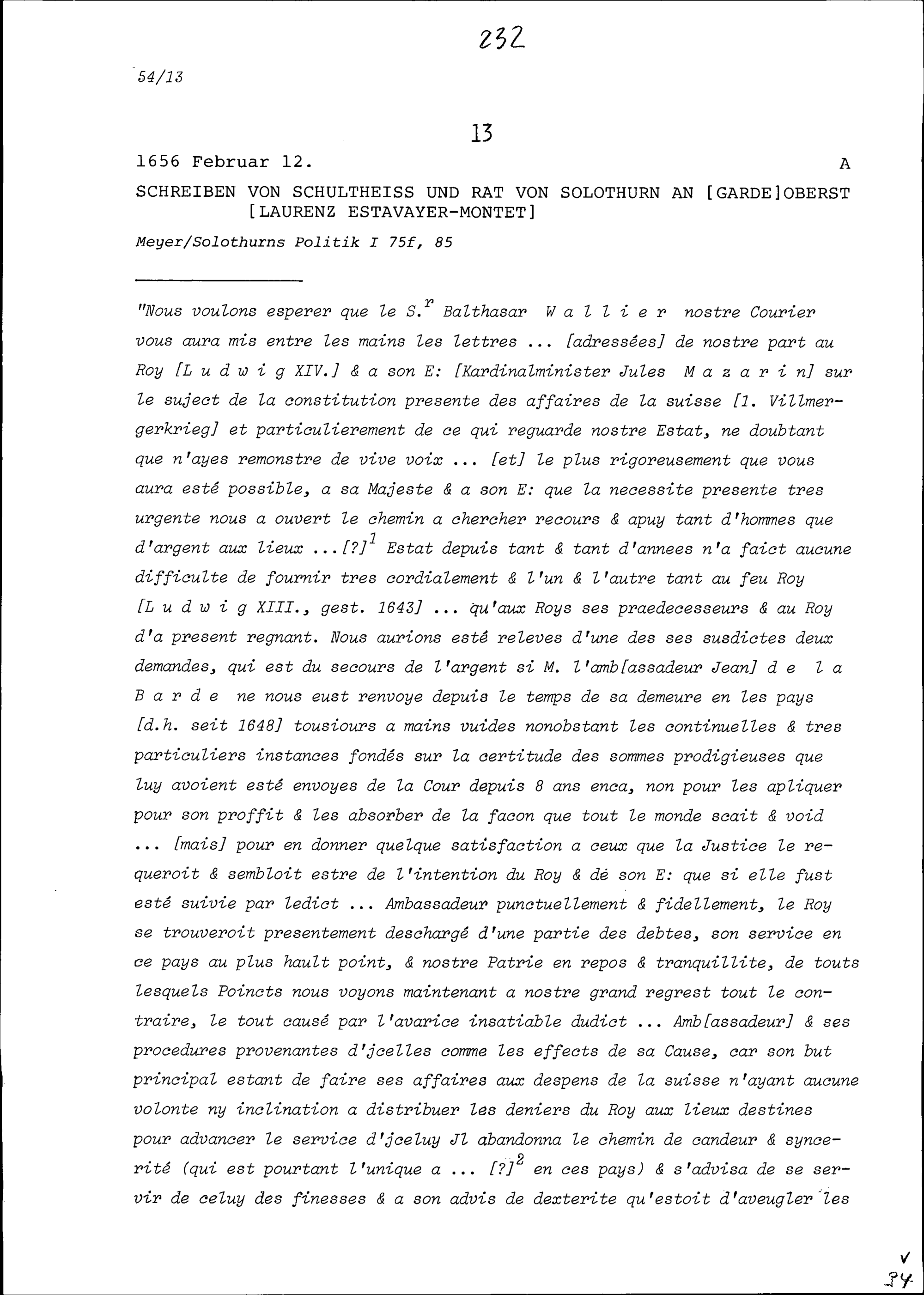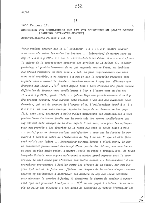 Schreiben des Schultheiss und Rats Solothurn an Laurenz d'Estavayer-Montet, Gard...