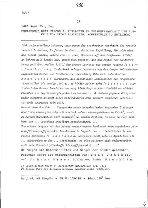 Erklärung von Beat Jakob I. Zurlauben in Zusammenhang mit dem Auskauf von Leonz Zurlauben, Konventuale zu Engelberg