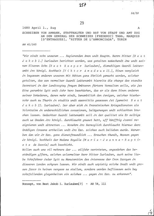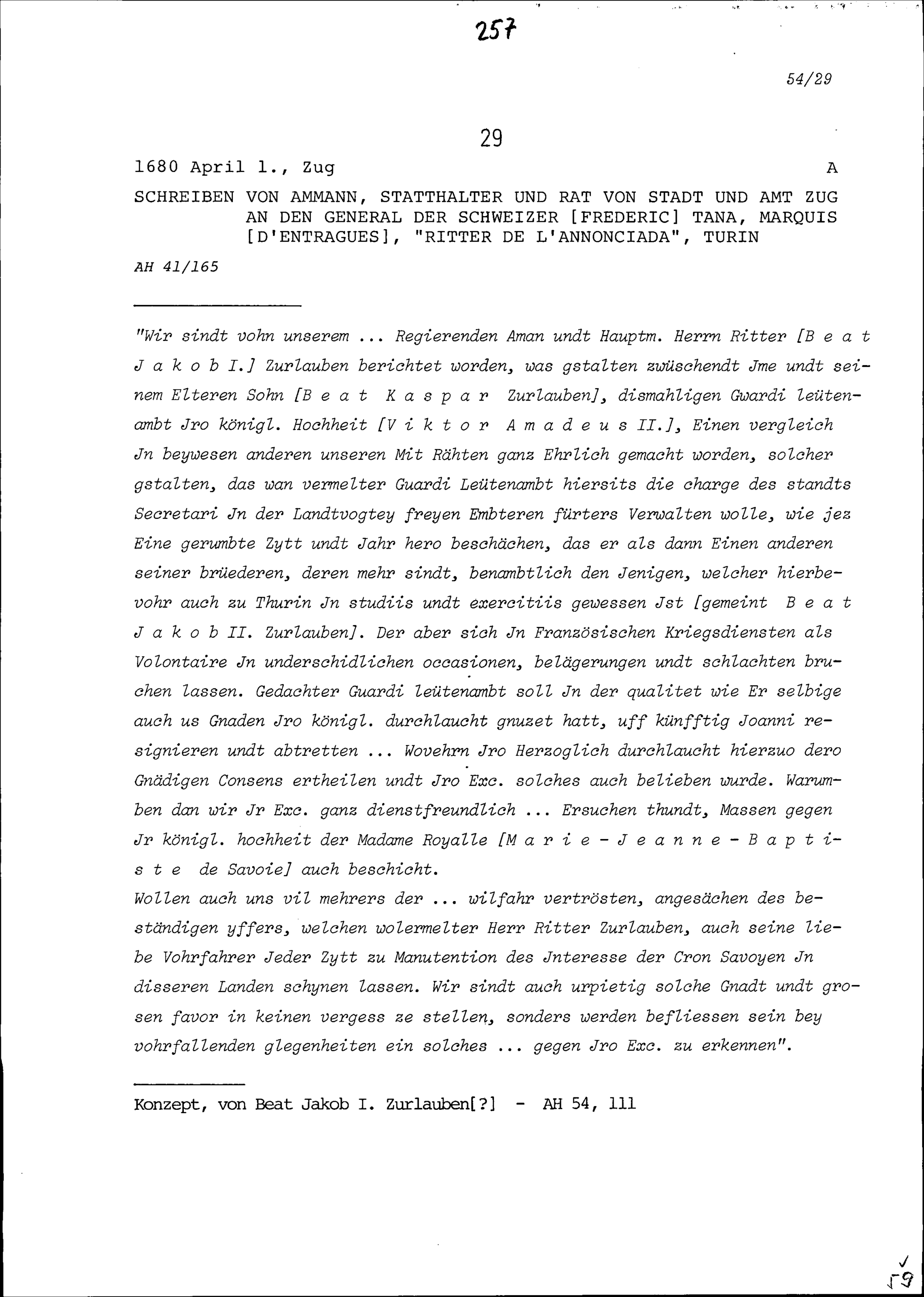 Schreiben des Ammanns, Statthalters und Rats von Stadt und Amt Zug an Frédéric Tana, Marquis d'Entragues,General, Turin