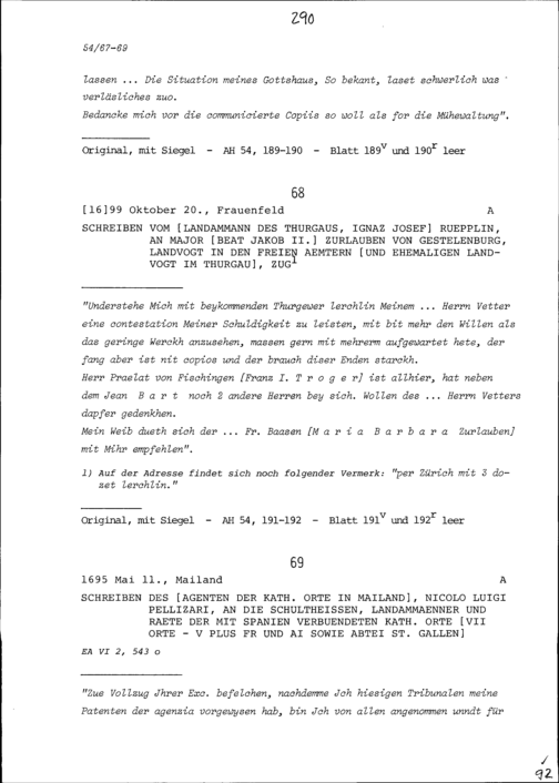 Schreiben von Ignaz Josef Rüpplin, Landammann des Thurgaus, an Beat Jakob II. Zurlauben, Major, Landvogt in den Freien Ämter und Altlandvogt im Thurgau, Zug