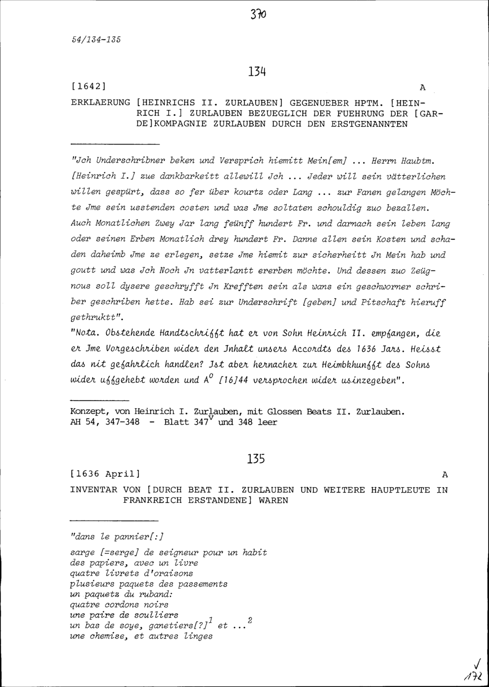 Erklärung von Heinrich II. Zurlauben gegenüber Heinrich I. Zurlauben, Hauptmann,...