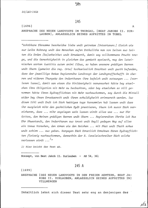 Ansprache von Beat Jakob II. Zurlauben, neuer Landvogt im Thurgau, anlässlich seines Aufritts in Tobel