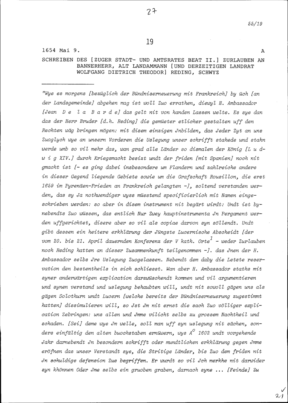 Schreiben von Beat II. Zurlauben, Stadt- und Amtrat Zug, an Wolfgang Dietrich Theodor Reding, Bannerherr, Altlandammann und Landrat, Schwyz