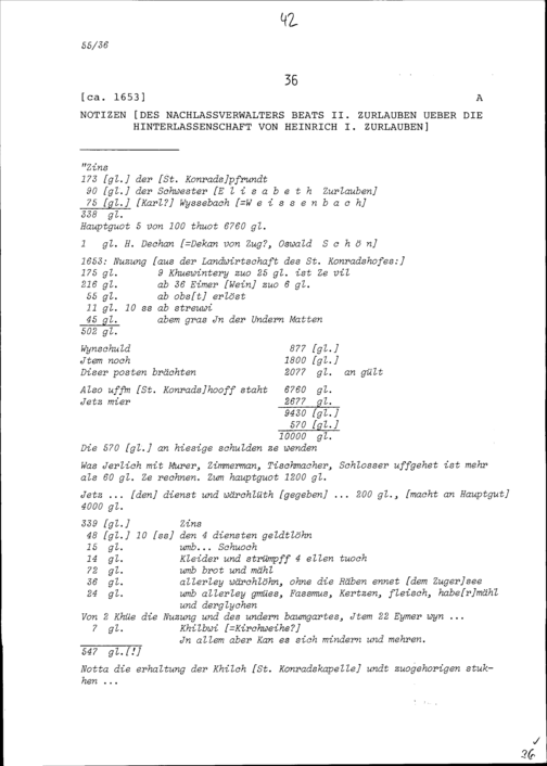 Notiz von Beat II. Zurlauben, Nachlassverwalter, über die Hinterlassenschaft von Heinrich I. Zurlauben