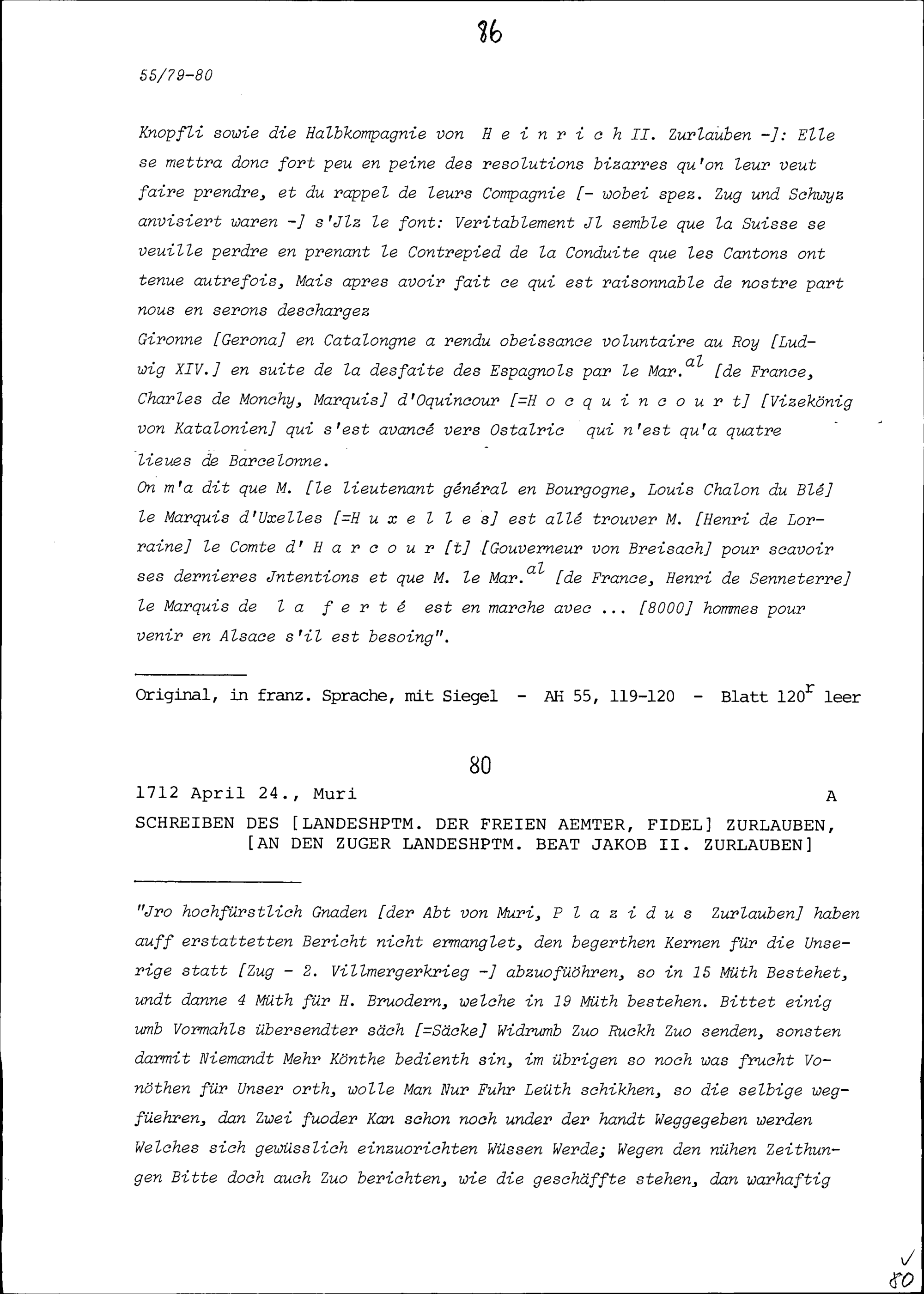 Schreiben von Fidel Zurlauben, Landeshauptmann der Freien Ämter, an Beat Jakob II. Zurlauben, Zuger Landeshauptmann