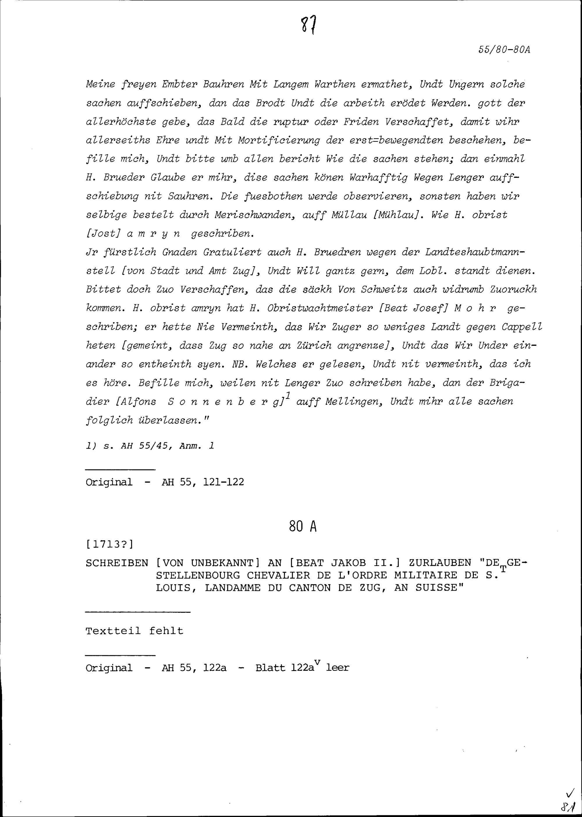 Schreiben von Unbekannt an Beat Jakob II. Zurlauben, Zug