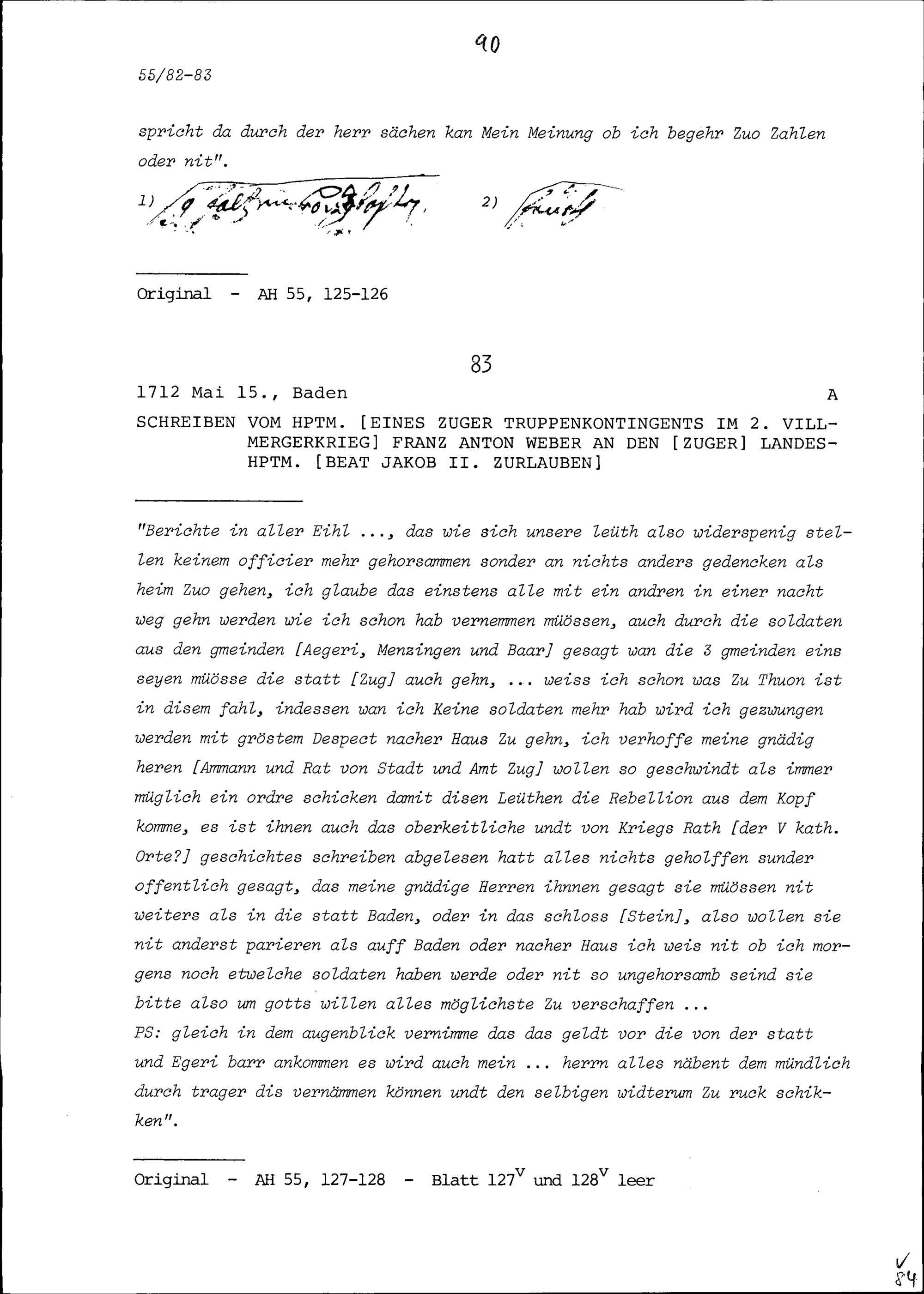 Schreiben von Franz Anton Weber, Hauptmann eines Zuger Truppenkontingents im Zweiten Villmergerkrieg, an Beat Jakob II. Zurlauben, Zuger Landeshauptmann