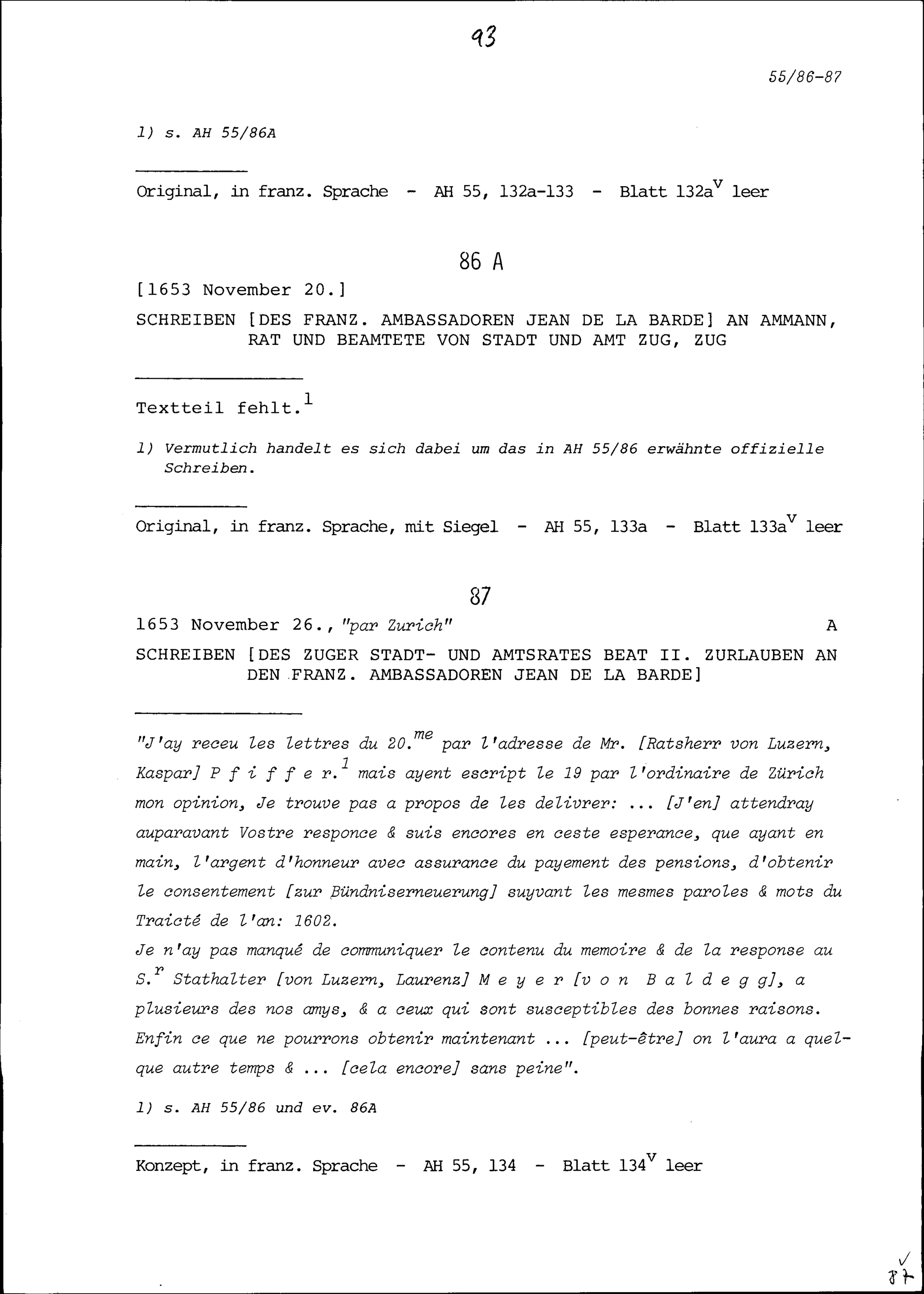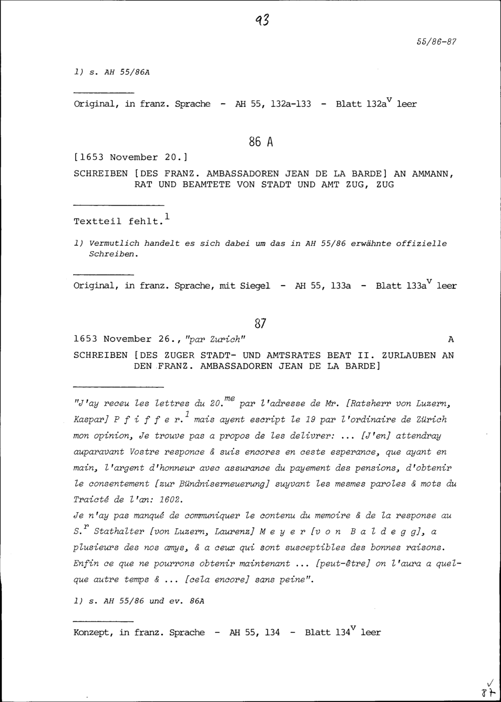 Schreiben von Jean de la Barde, Ambassador von Frankreich, an Ammann, Rat und Beamtete von Stadt und Amt Zug, Zug