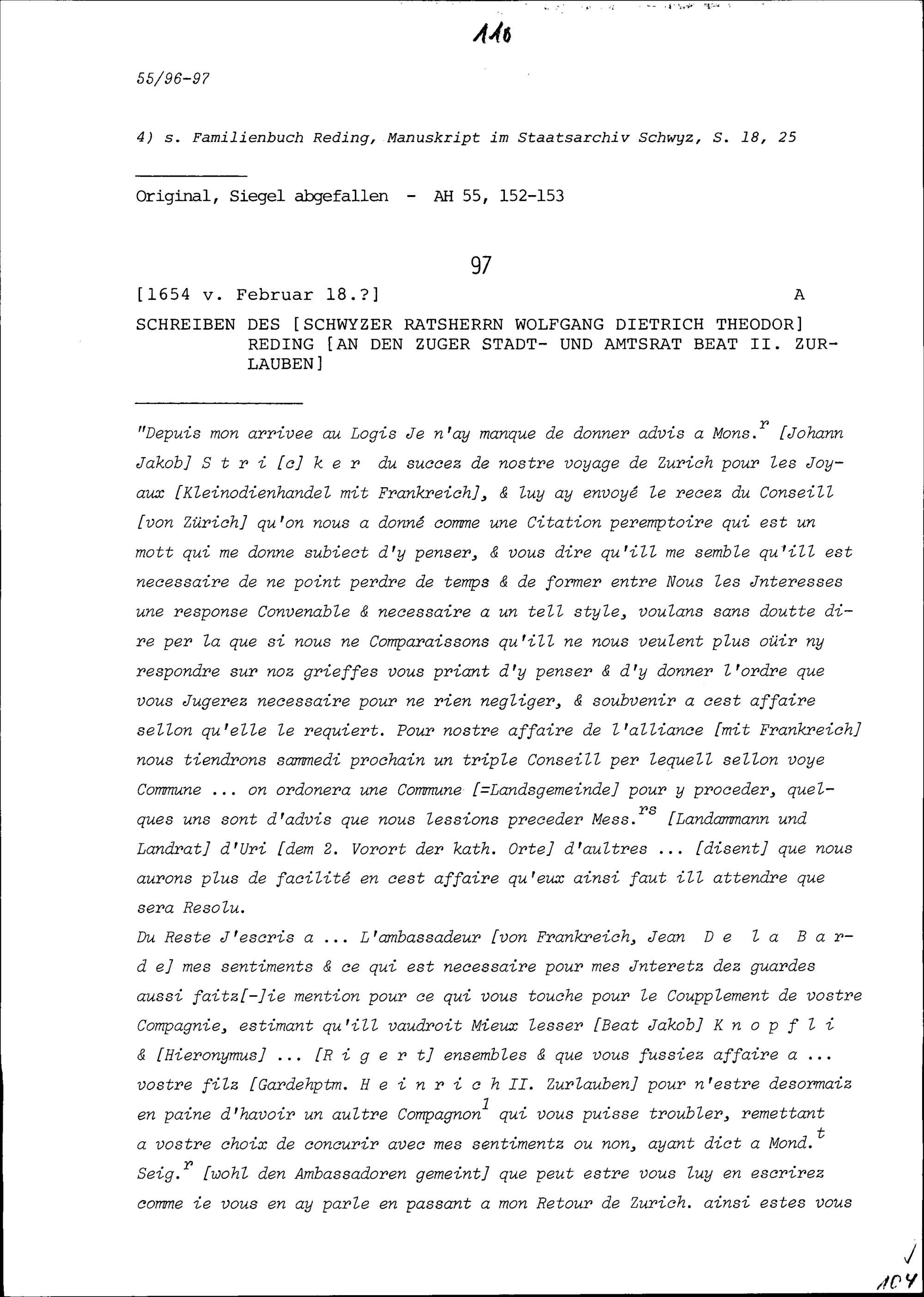 Schreiben von Wolfgang Dietrich Theodor Reding, Ratsherr Schwyz, an Beat II. Zurlauben, Stadt- und Amtrat Zug