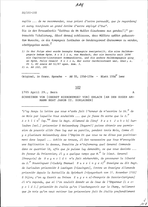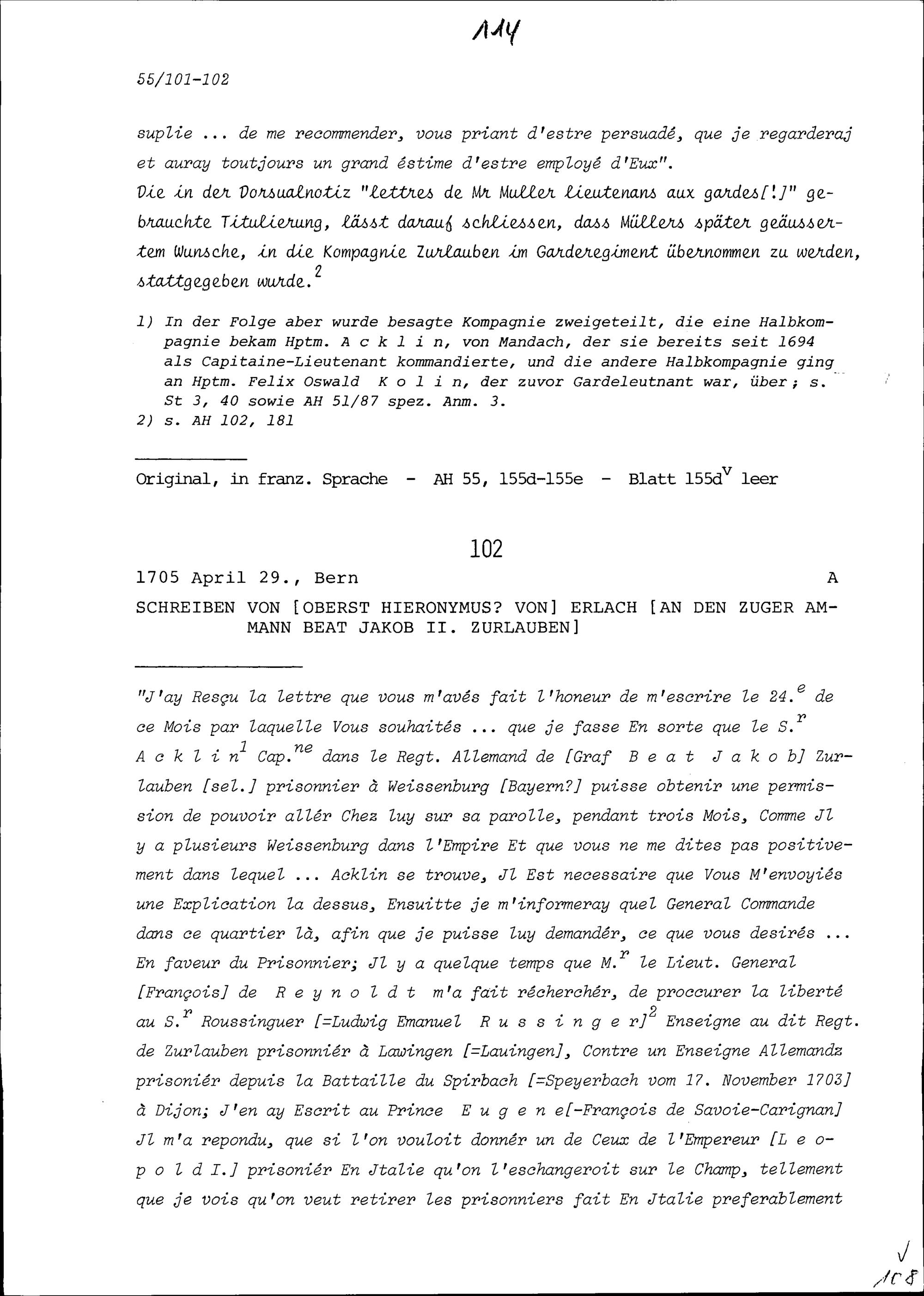 Schreiben von Hieronymus von Erlach, Oberst, an Beat Jakob II. Zurlauben, Ammann