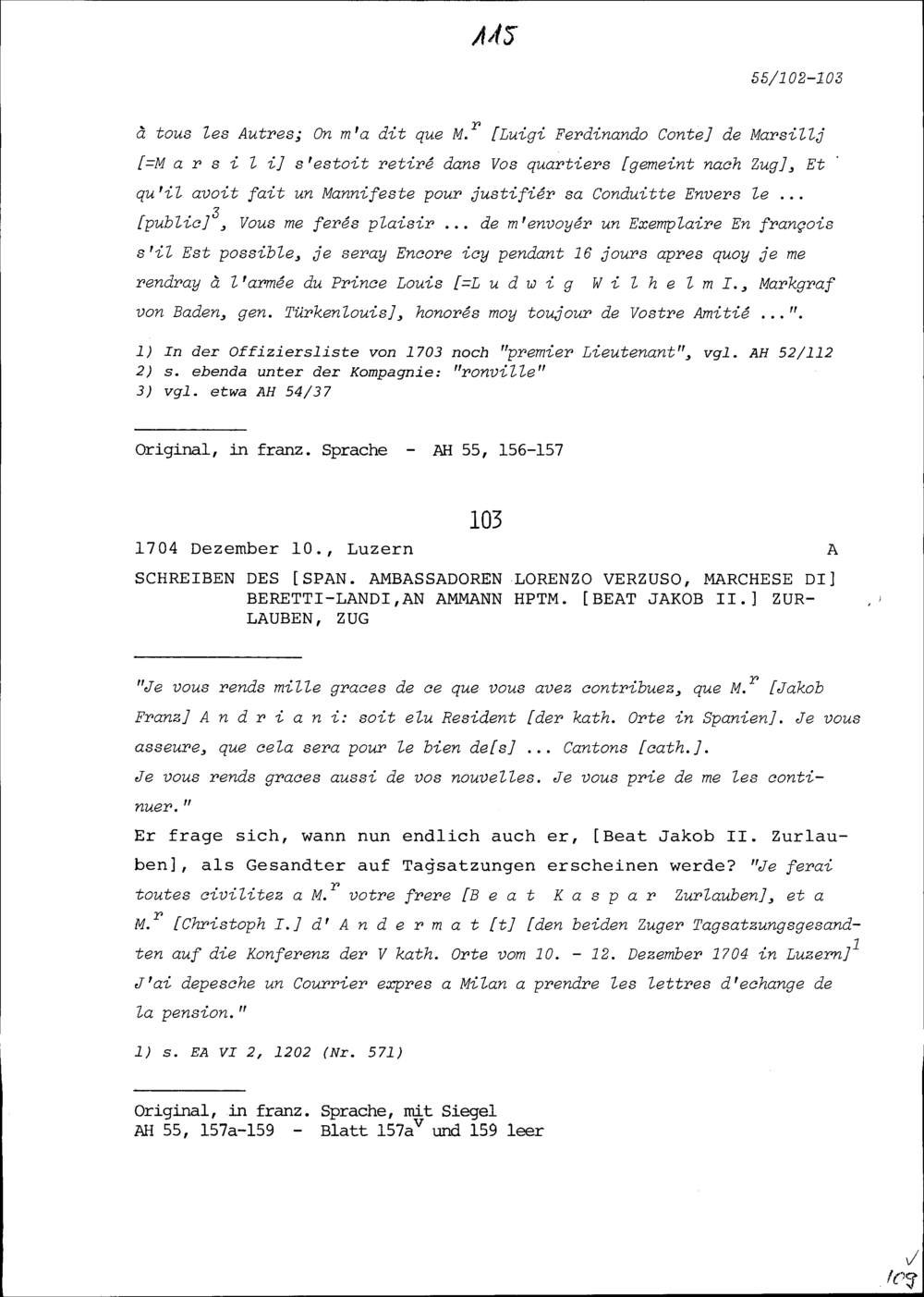 Schreiben von Lorenzo Verzuso, Marchese di Beretti-Landi, Ambassador von Spanien, an Beat Jakob II. Zurlauben, Ammann und Hauptmann, Zug
