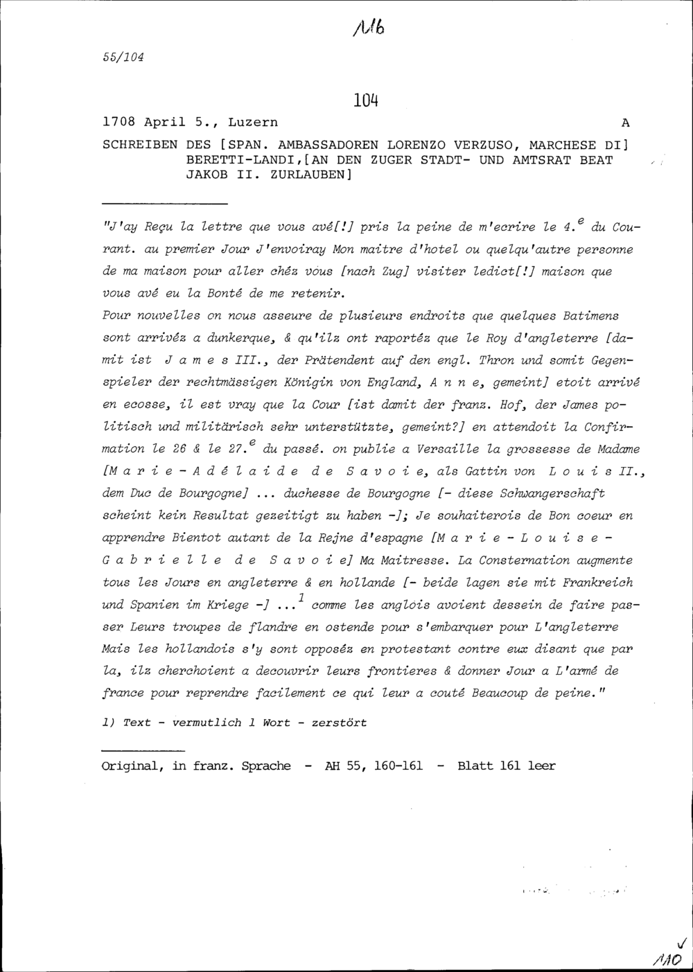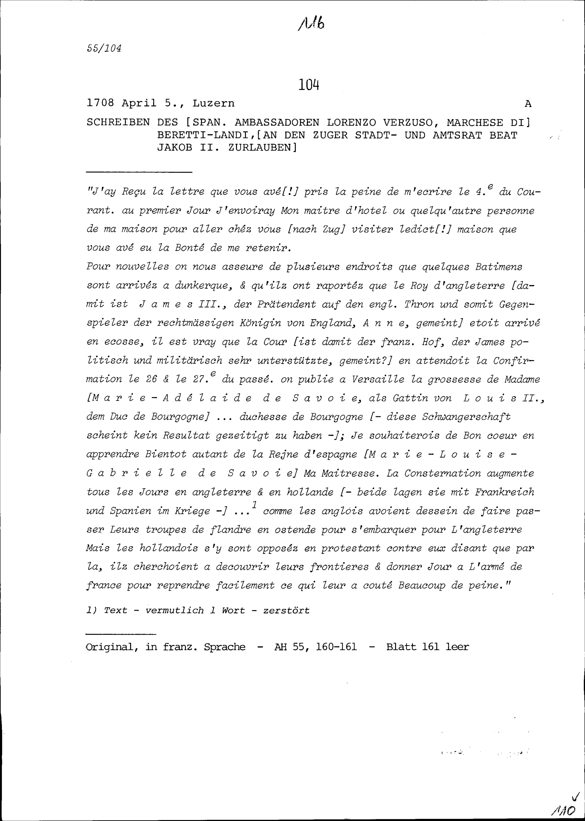 Schreiben von Lorenzo Verzuso, Marchese di Beretti-Landi, Ambassador von Spanien, an Beat Jakob II. Zurlauben, Stadt- und Amtrat Zug