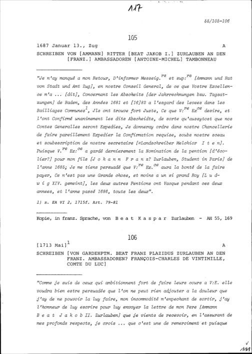 Schreiben von Beat Jakob I. Zurlauben, Ammann, an Antoine-Michel Tambonneau, Ambassador...