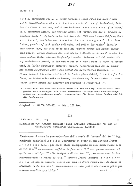 Schreiben von Beat Kaspar Zurlauben, Ammann, an Giuseppe Calzolari, Internuntius,...