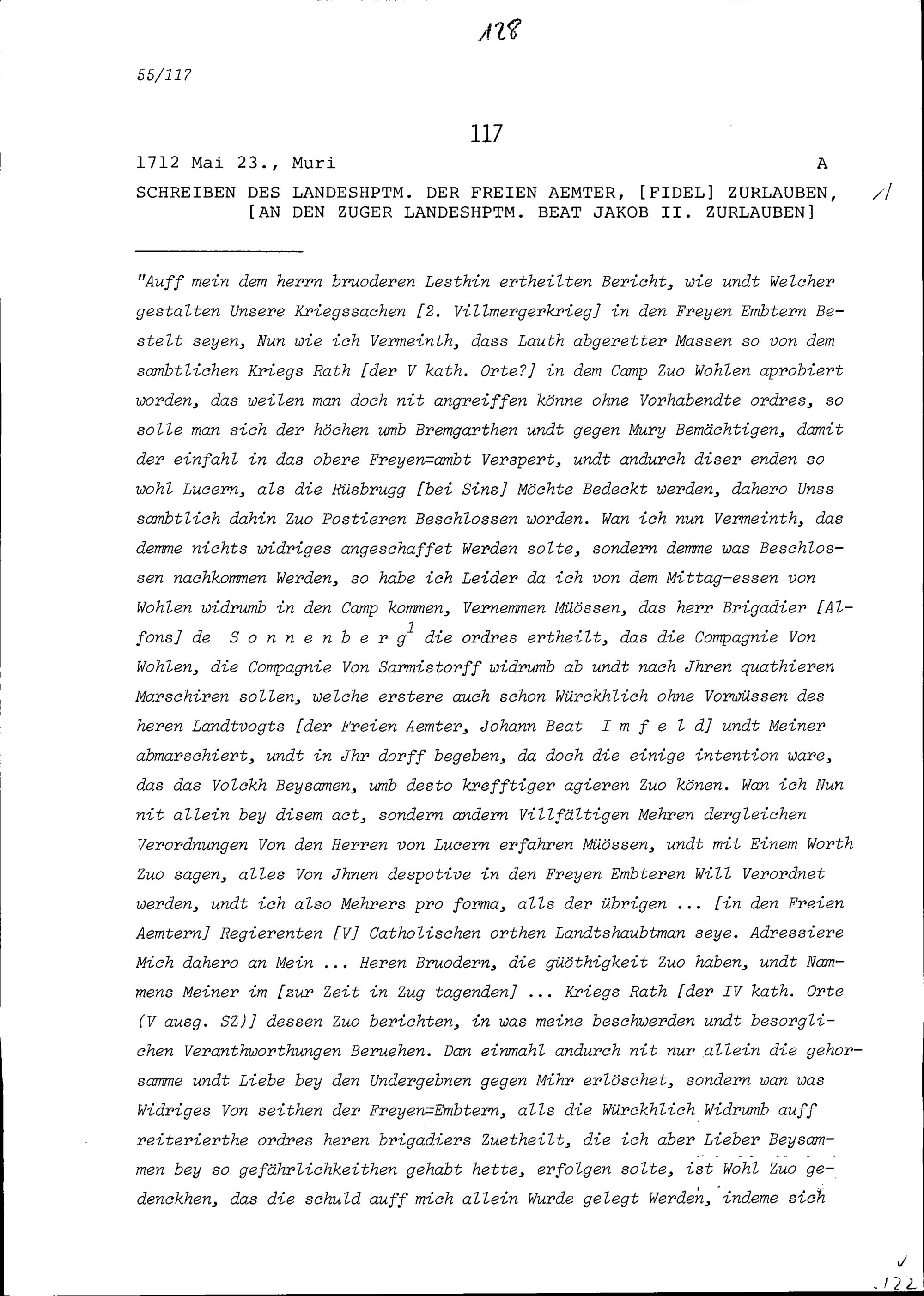 Schreiben von Fidel Zurlauben, Landeshauptmann der Freien Ämter, an Beat Jakob II. Zurlauben, Zuger Landeshauptmann