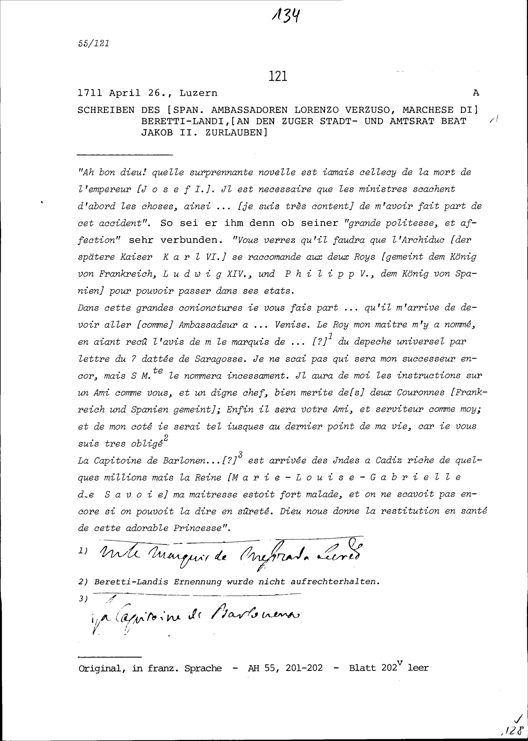 Schreiben von Lorenzo Verzuso, Marchese di Beretti-Landi, Ambassador von Spanien, an Beat Jakob II. Zurlauben, Stadt- und Amtrat Zug