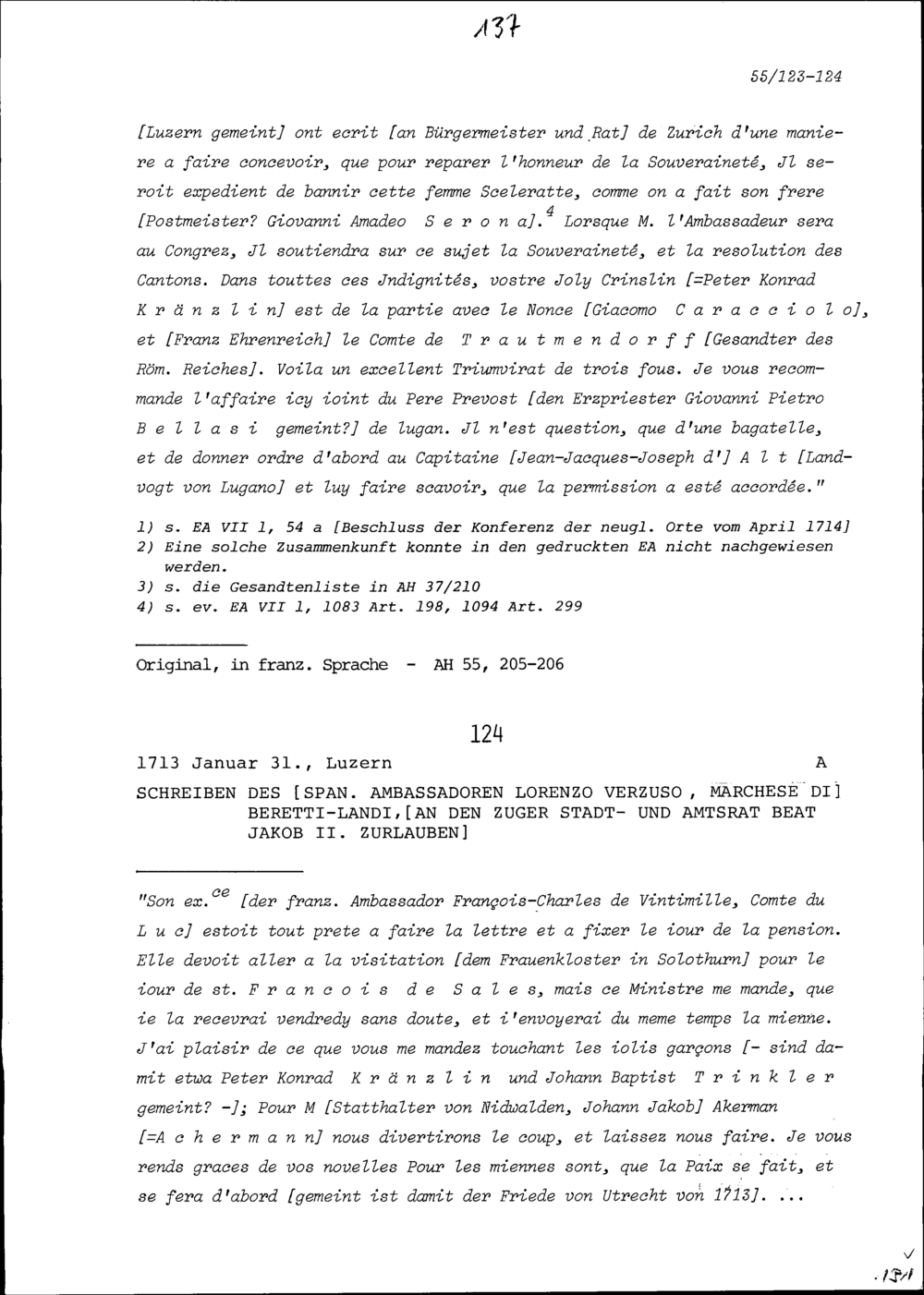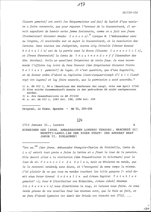 Schreiben von Lorenzo Verzuso, Marchese di Beretti-Landi, Ambassador von Spanien, an Beat Jakob II. Zurlauben, Stadt- und Amtrat Zug