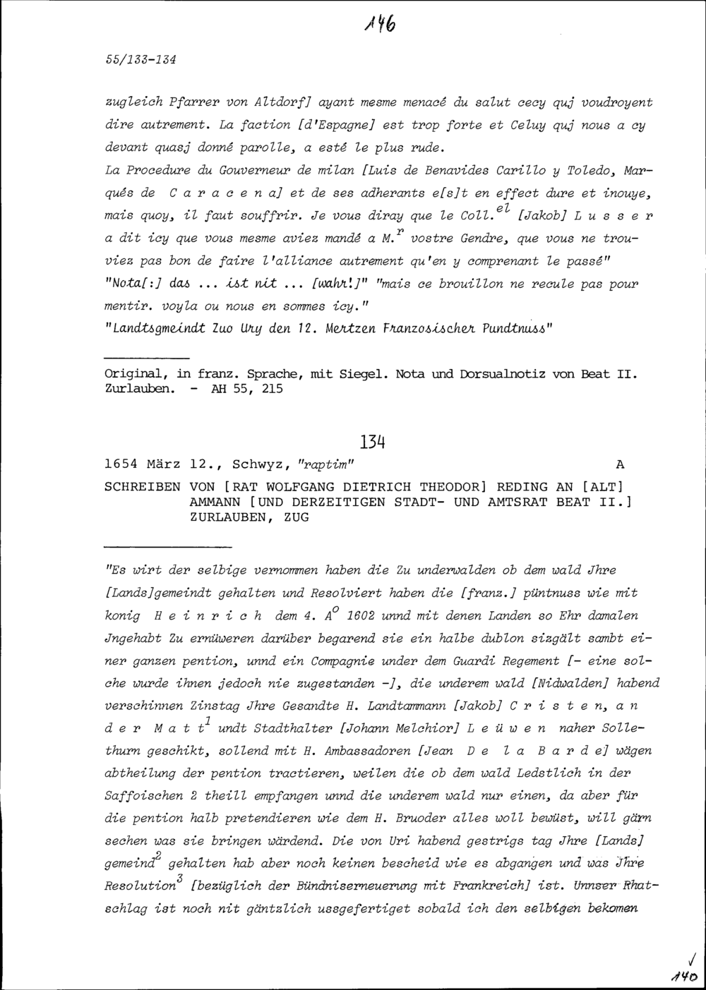 Schreiben von Wolfgang Dietrich Theodor Reding, Rat, an Beat II. Zurlauben, Altammann...