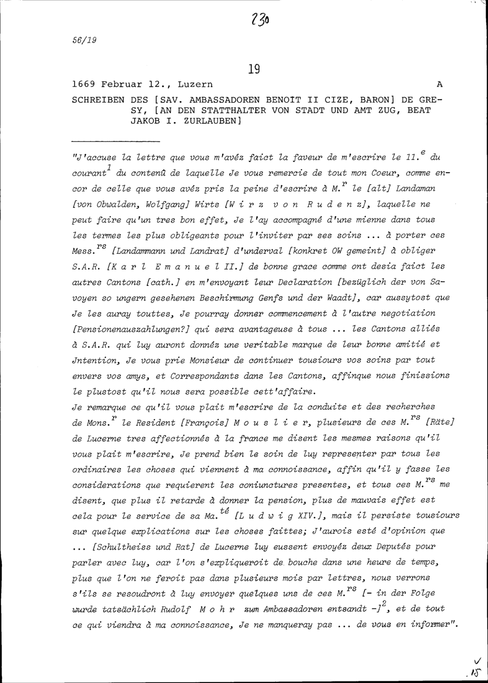 Schreiben von Benoît II. Cize, Baron de Grésy, Ambassador von Frankreich, an Beat Jakob I. Zurlauben, Statthalter von Stadt und Amt Zug