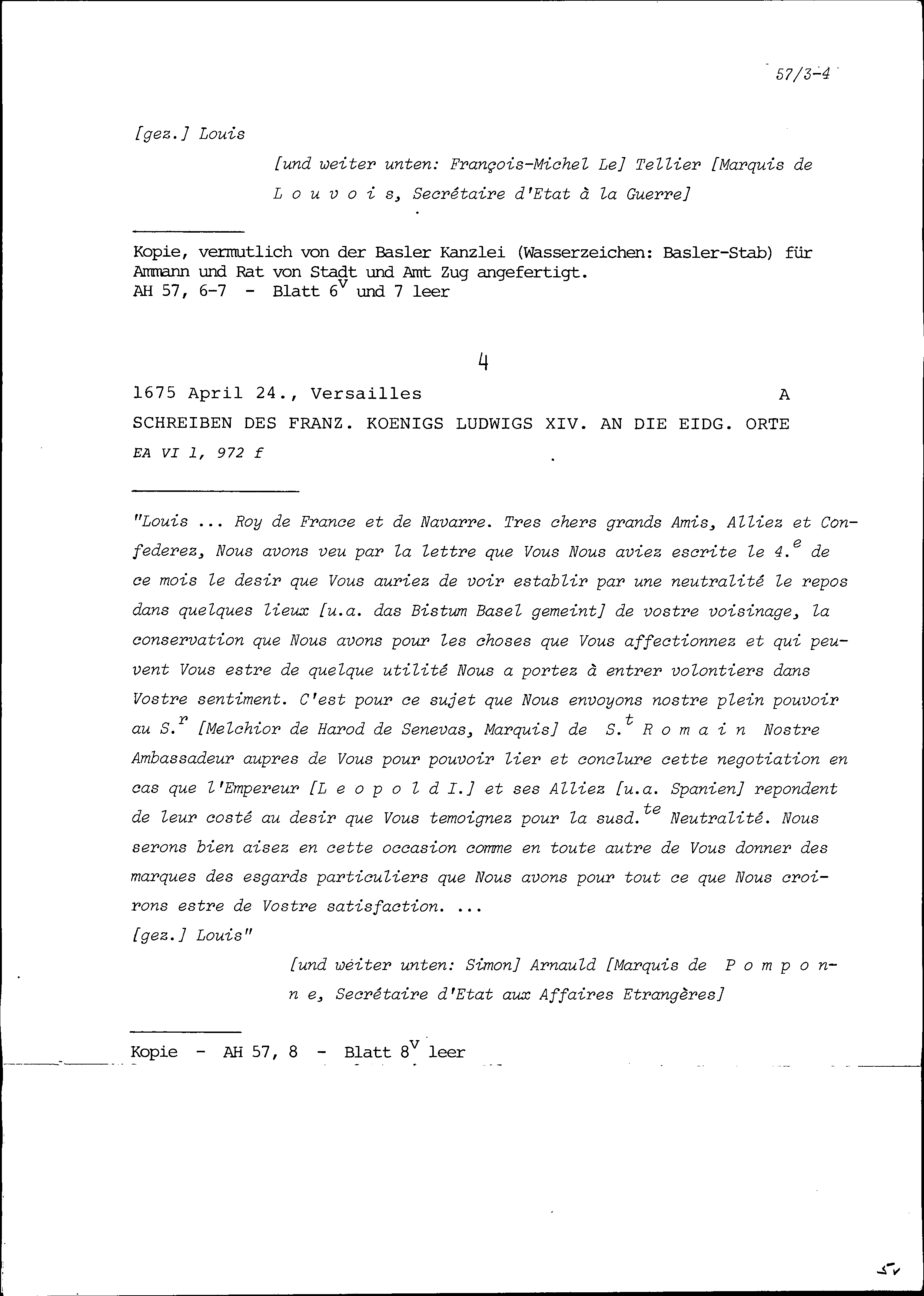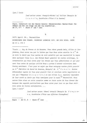 Schreiben von Ludwig XIV., König von Frankreich, an die Eidgenössischen Orte