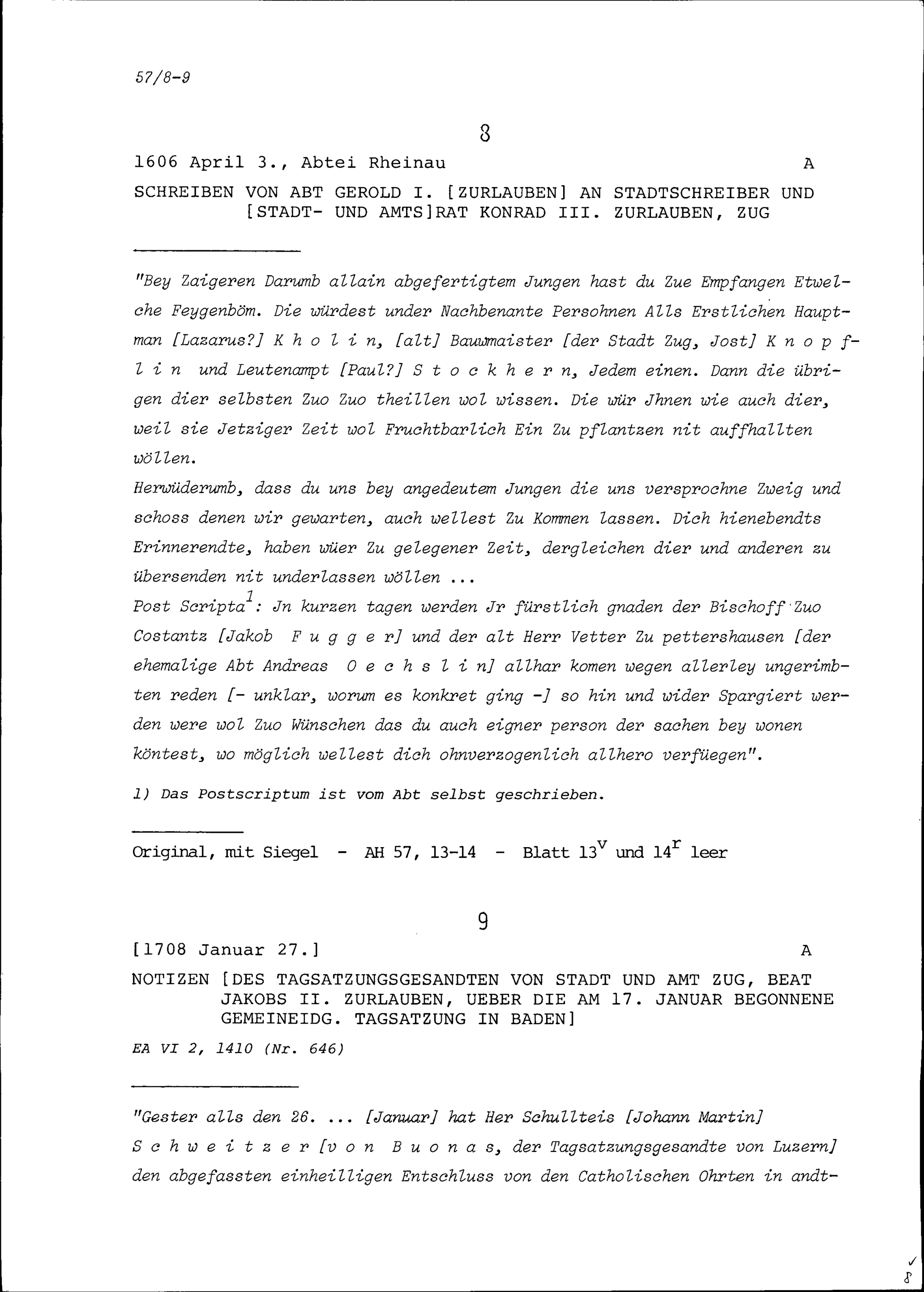 Schreiben von Gerold I. Zurlauben, Abt, an Konrad III. Zurlauben, Stadtschreiber und Stadt- und Amtrat, Zug
