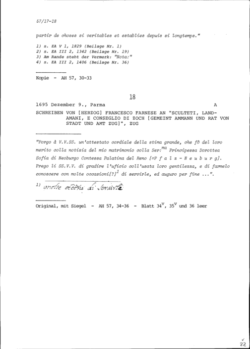 Schreiben von Francesco Farnese, Herzog, an Ammann und Rat von Stadt und Amt Zug,...
