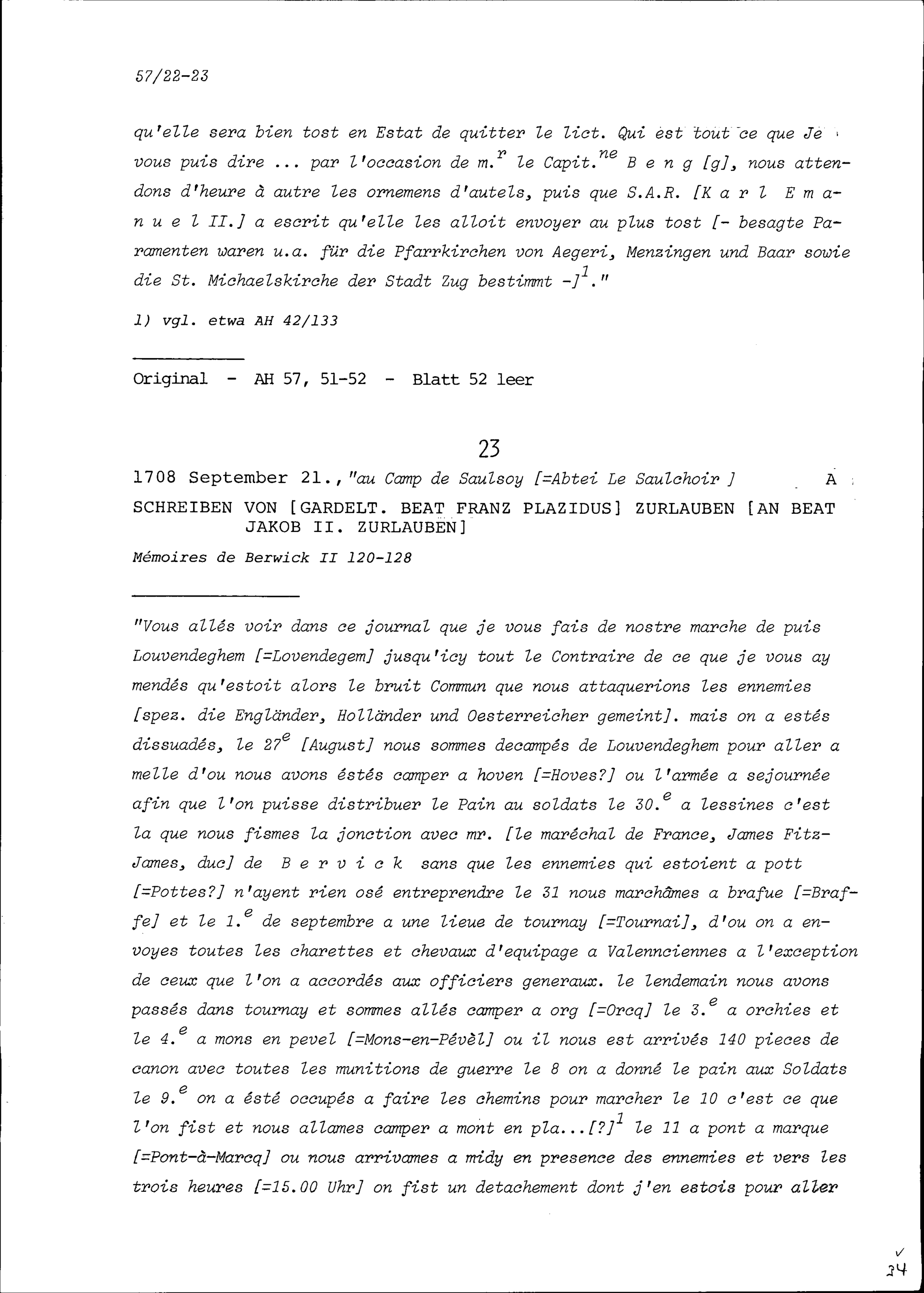 Schreiben von Beat Franz Plazidus Zurlauben, Gardeleutnant, an Beat Jakob II. Zurlauben
