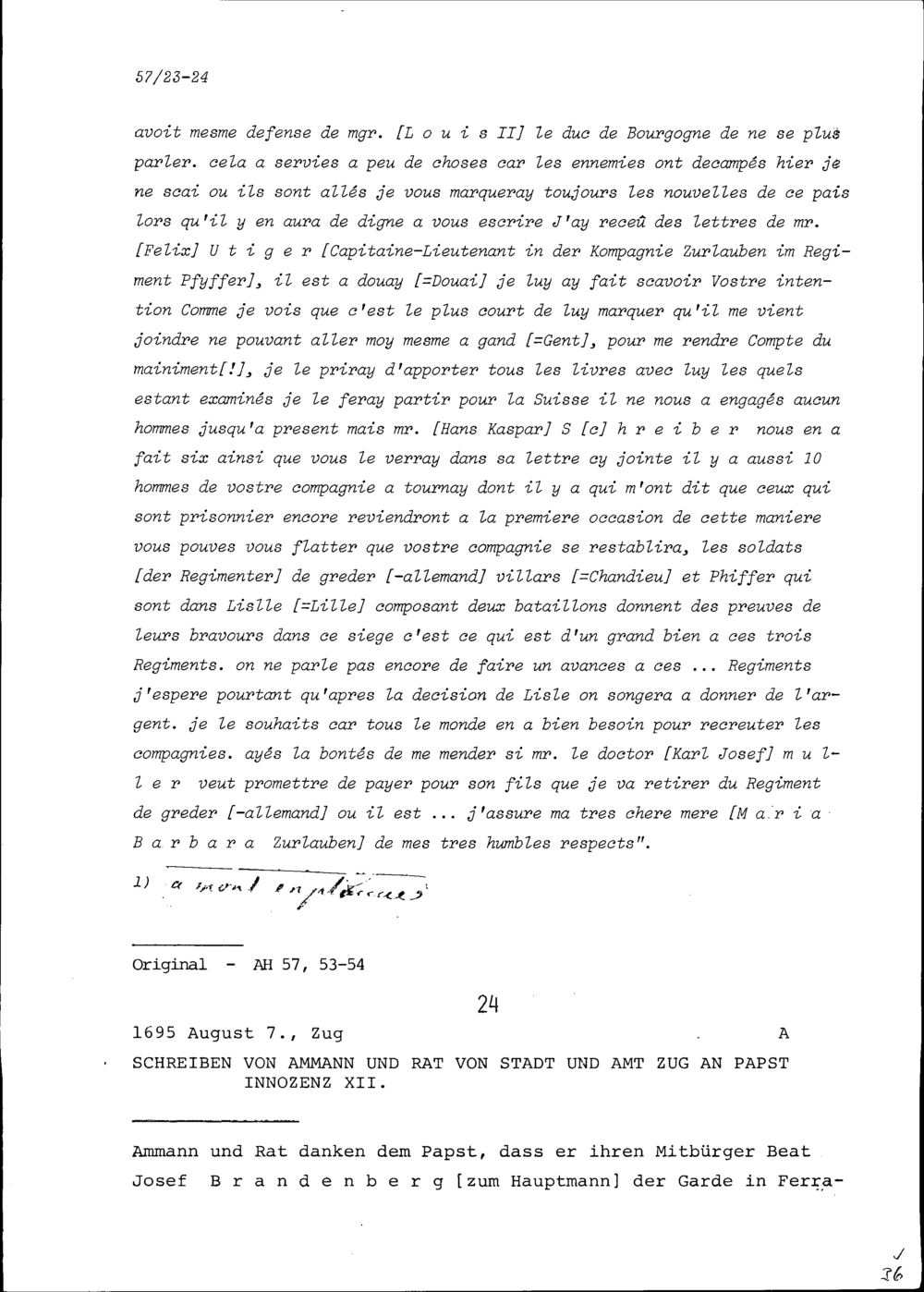 Schreiben des Ammanns und Rats von Stadt und Amt Zug an Innozenz XII., Papst