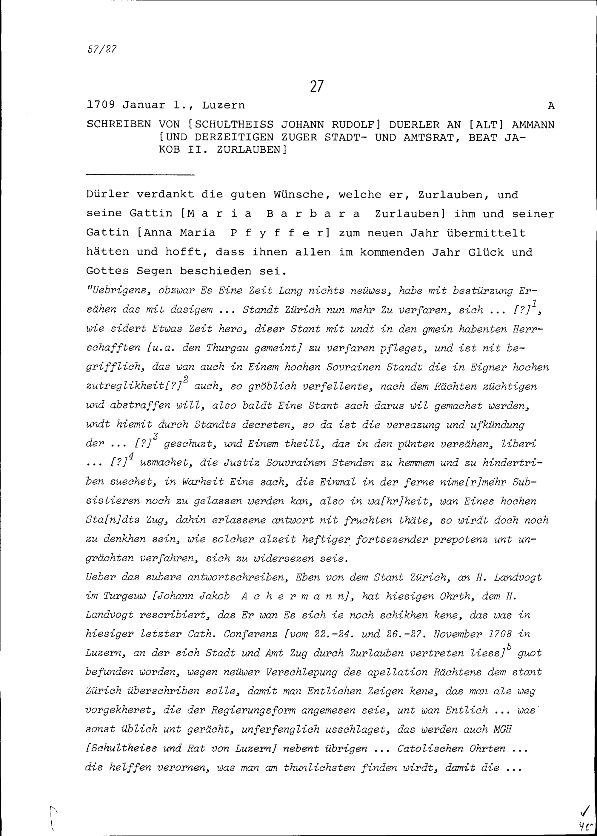 Schreiben von Johann Rudolf Dürler, Schultheiss, an Beat Jakob II. Zurlauben, Altammann und Stadt- und Amtrat Zug