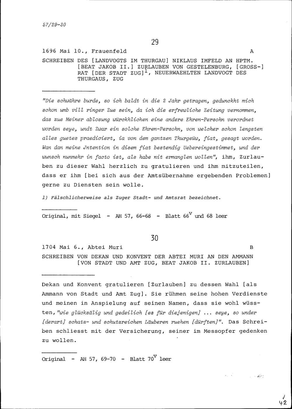 Schreiben von Niklaus Imfeld, Landvogt im Thurgau, an Beat Jakob II. Zurlauben, Hauptmann, Grossrat der Stadt Zug und neuerwählten Landvogt des Thurgaus, Zug